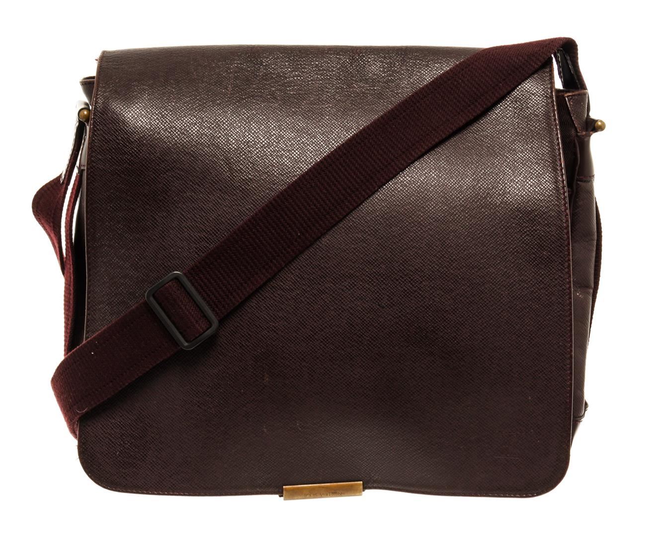 One Louis Vuitton Gray Taiga Leather Abbesses Messenger Bag. Item is sold AS-IS. All available information is listed in the description and shown in the photo. Louis Vuitton Gray Taiga Leather Abbesses messenger features gold-tone hardware, nylon adjustable shoulder strap, red canvas lining, three interior pockets, flap top with elastic loop closure.