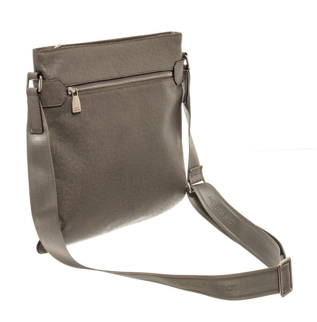 One Louis Vuitton Gray Taiga Leather Sasha Crossbody Bag. Item is sold AS-IS. All available information is listed in the description and shown in the photo. Louis Vuitton Gray Taiga Leather Sasha Crossbody Bag with taiga leather, silver-tone hardware, front zip and rear flat pockets, two interior flat pockets, adjustable fabric strap, zip top closure.
