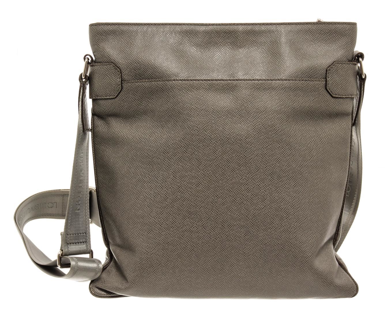 One Louis Vuitton Gray Taiga Leather Sasha Crossbody Bag. Item is sold AS-IS. All available information is listed in the description and shown in the photo. Louis Vuitton Gray Taiga Leather Sasha Crossbody Bag with taiga leather, silver-tone hardware, front zip and rear flat pockets, two interior flat pockets, adjustable fabric strap, zip top closure.