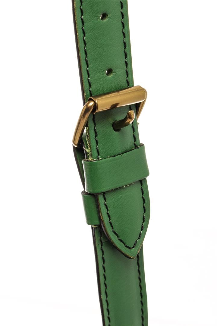 Louis Vuitton Green Epi Leather Cartouchiere Messenger Bag. All available information is listed in the description and shown in the photos. Louis Vuitton Green Epi Leather Cartouchiere Messenger Bag with green epi leather, brass hardware, single adjustable shoulder strap, canvas lining & single interior pocket, buckle closure at front. Height: 7" Width: 8" Depth: 2.5", Shoulder Strap Drop: 16-20" / 17.78 x 20.32 x 6.35 Cm