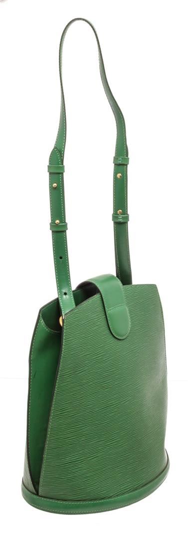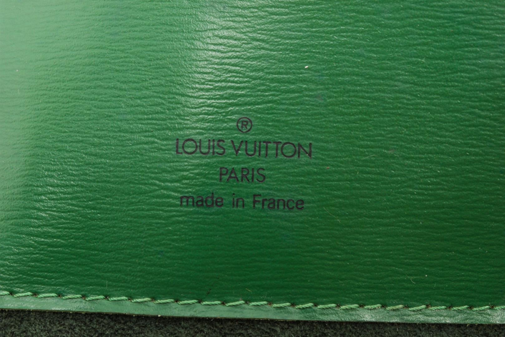 Louis Vuitton Green Epi Leather Cluny Shoulder Bag with gold-tone hardware, tan vachetta leather trim, interior zip pockets, canvas lining, dual top handles, and zip closure.