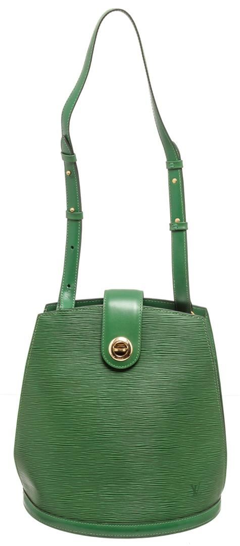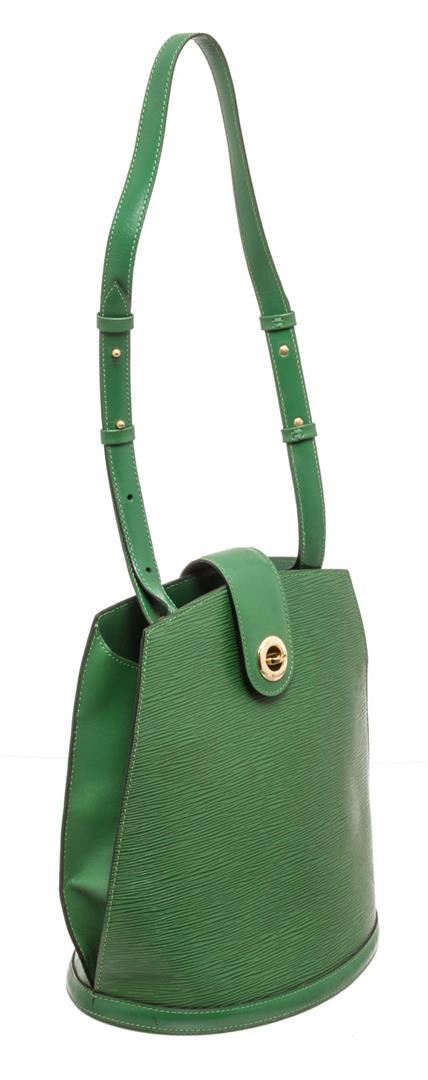 Louis Vuitton Green Epi Leather Cluny Shoulder Bag with gold-tone hardware, tan vachetta leather trim, interior zip pockets, canvas lining, dual top handles, and zip closure.