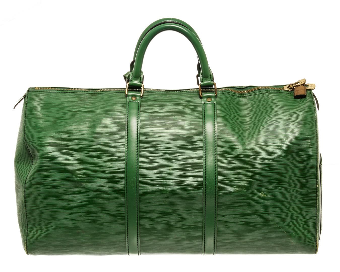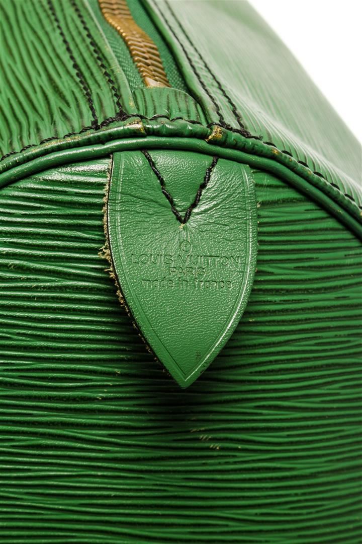 Louis Vuitton Green Epi Leather Keepall 50. All available information is listed in the description and shown in the photos. Louis Vuitton Green Epi Leather Keepall 50 with top handle, lock, suede lining, gold tone hardware and zipper closure