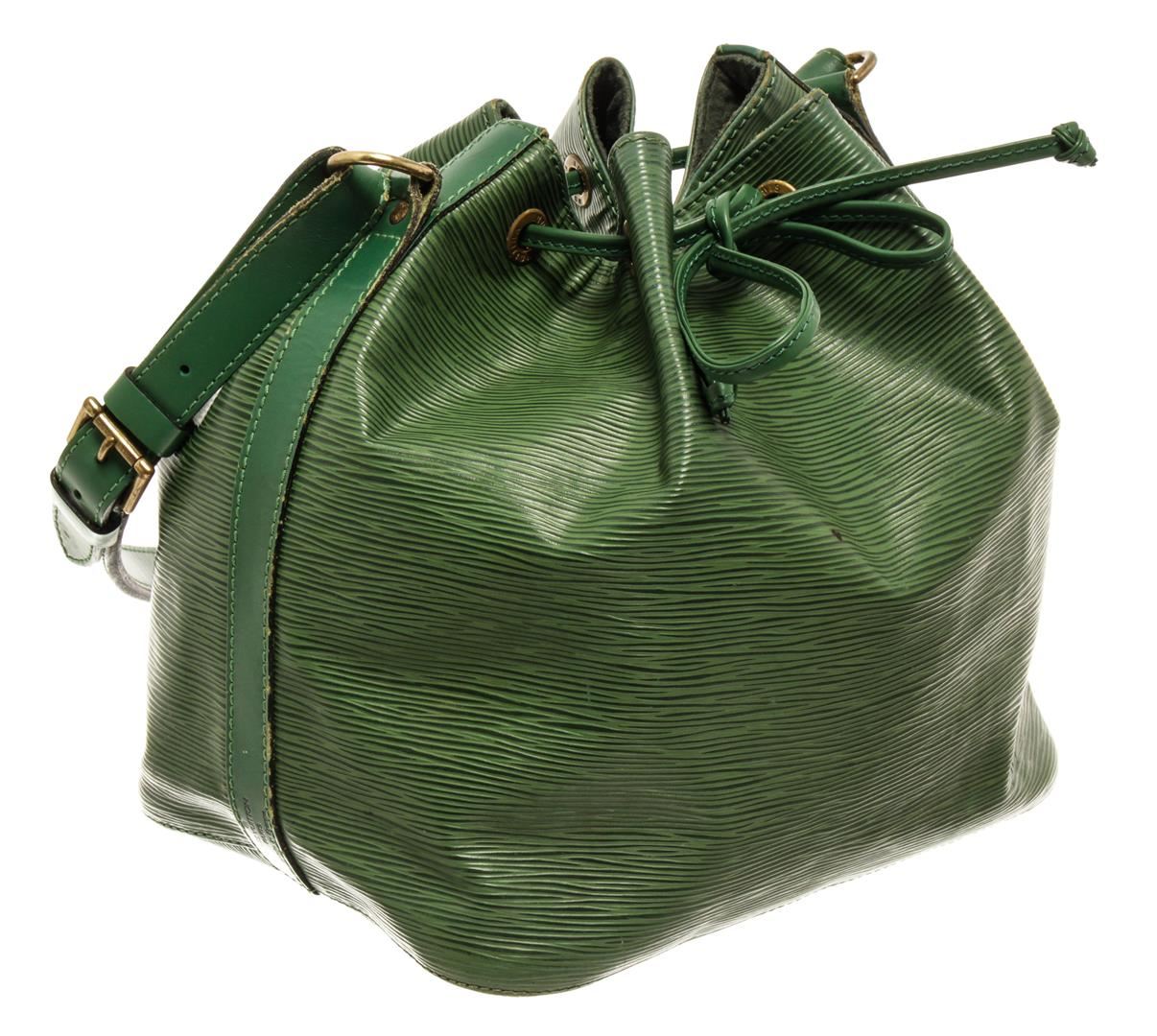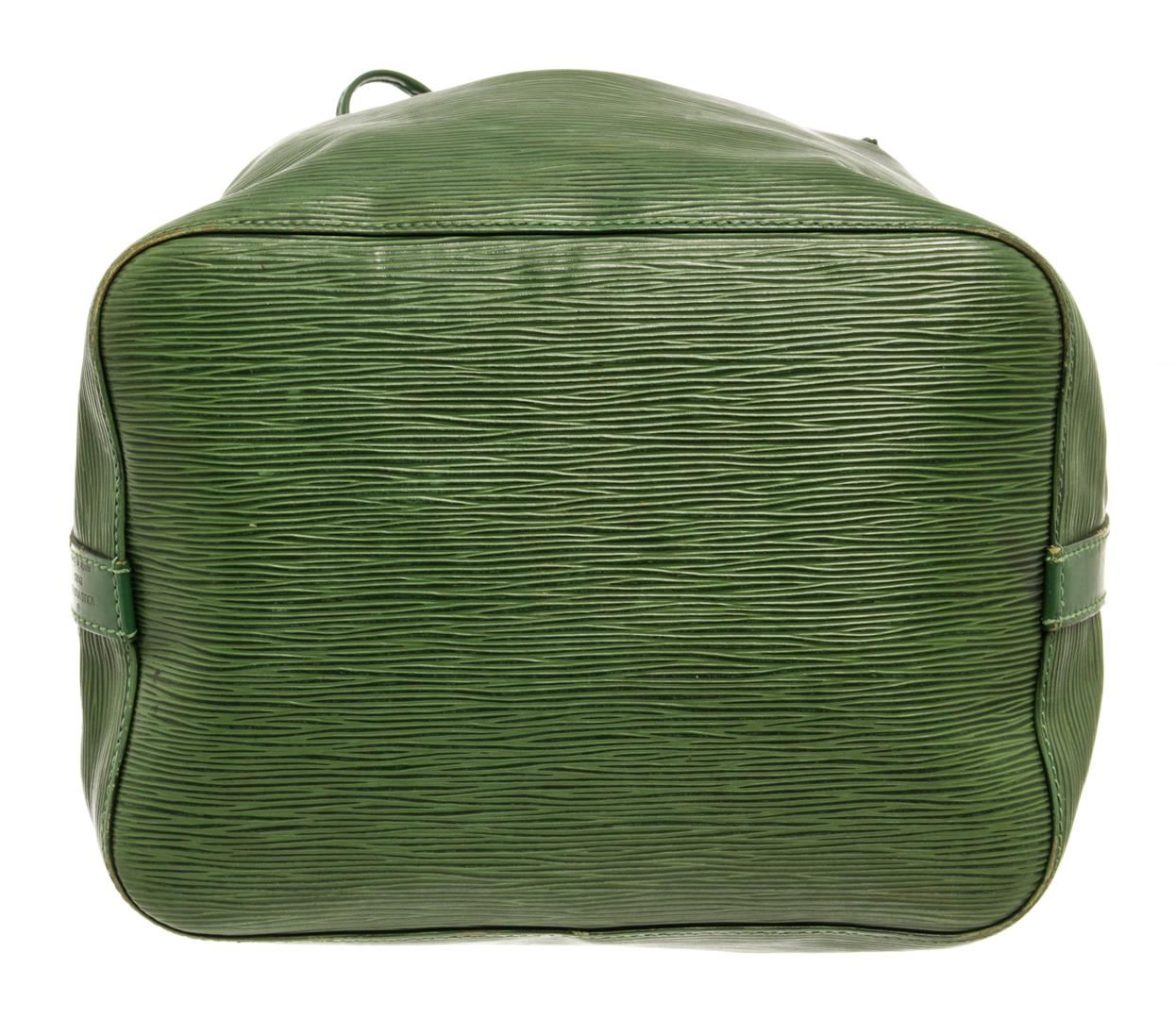 One Louis Vuitton Green Epi Leather Noe PM Bucket Bag. Item is sold AS-IS. All available information is listed in the description and shown in the photo. Louis Vuitton Green Epi Leather Noe PM Bucket Bag with adjustable shoulder strap, gold tone hardware, suede lining and drawstring closure.