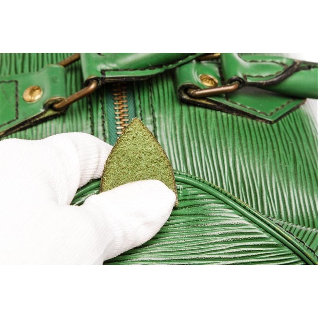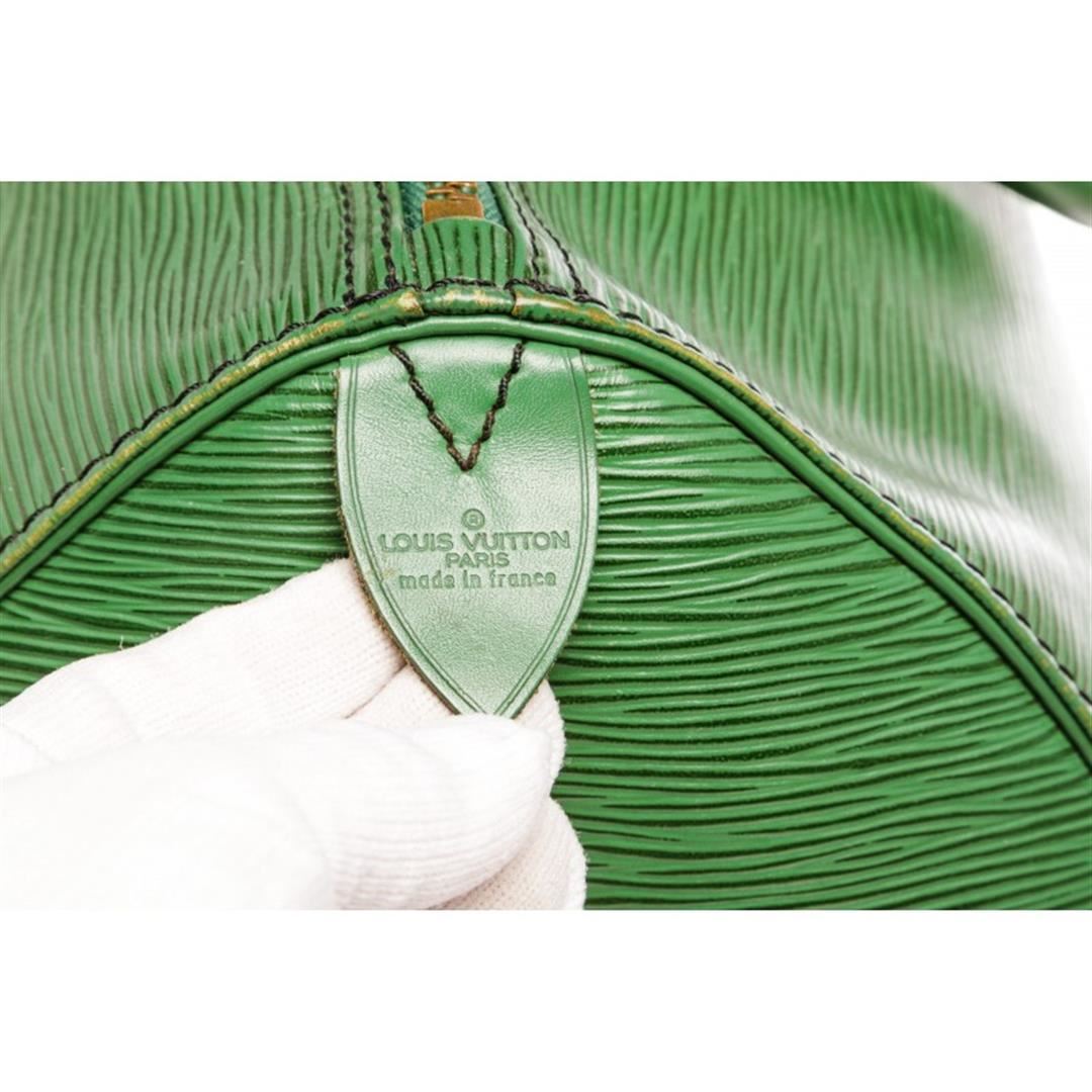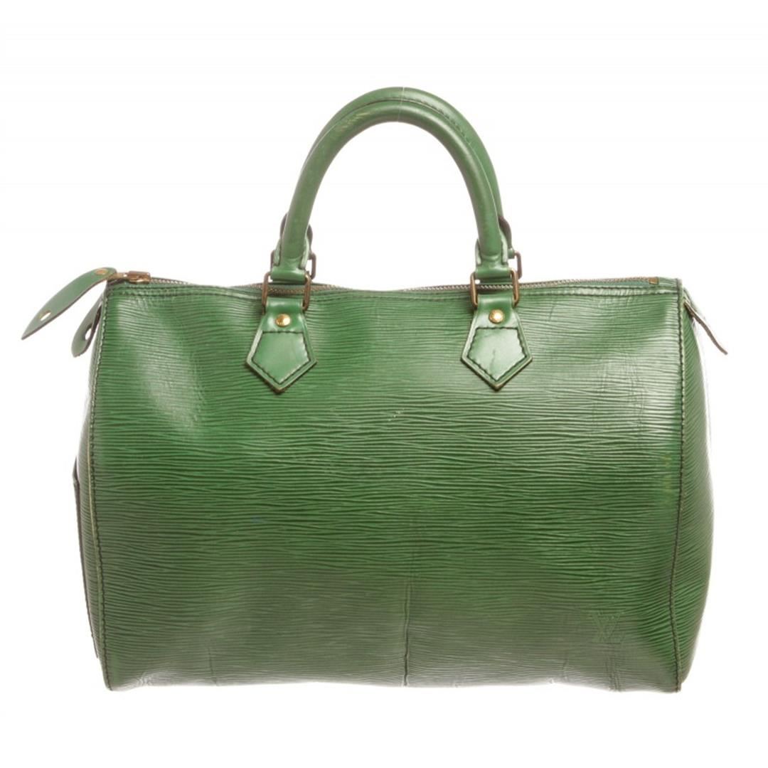 Green Epi leather Louis Vuitton Speedy 30 with brass hardware, dual rolled handles, embossed logo embellishment at front face, single slit pocket at exterior, tonal canvas lining, single slit pocket at interior wall and zip closure at top. Item is pre-owned.