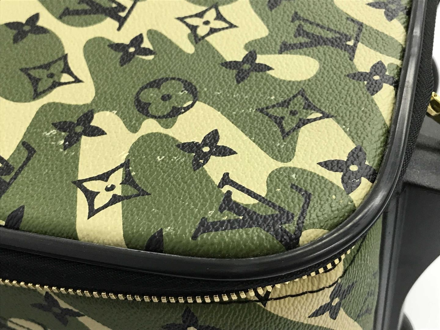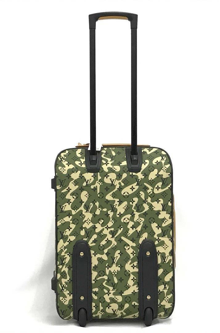 One Louis Vuitton Green Multicolor Monogramouflage Pegase 60cm Rolling Luggage. Item is sold AS-IS. All available information is listed in the description and shown in the photo. Men's olive green and multicolor Monogramouflage coated canvas Louis Vuitton Pgase 60 with gold-tone hardware, retractable top handle, dual leather side handles, tan vachetta leather trim, dual exterior pockets at front; one with concealed zip closure, dual wheels and protective feet at base, black nylon lining, dual velcro compression straps, single zip compartment at interior wall and two-way zip-around closure. Height: 21" Width: 15" Depth: 7" Retractable Handle Drop: 17" Handle Drop: 2"
