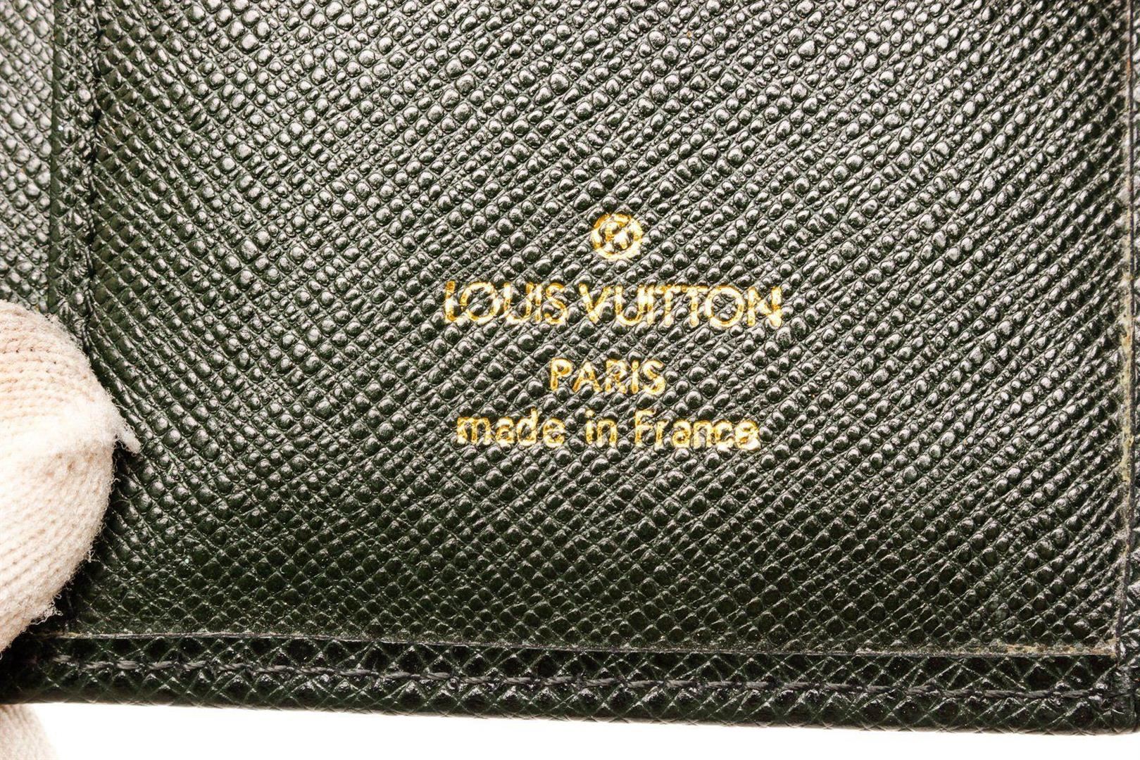 Louis Vuitton Green Taiga Leather Agenda PM Wallet with leather, gold-tone hardware, trim tan vachetta, interior three compartments pocket and snap closure.