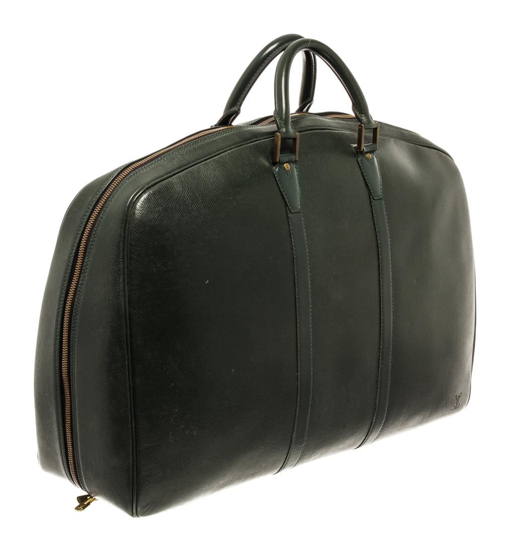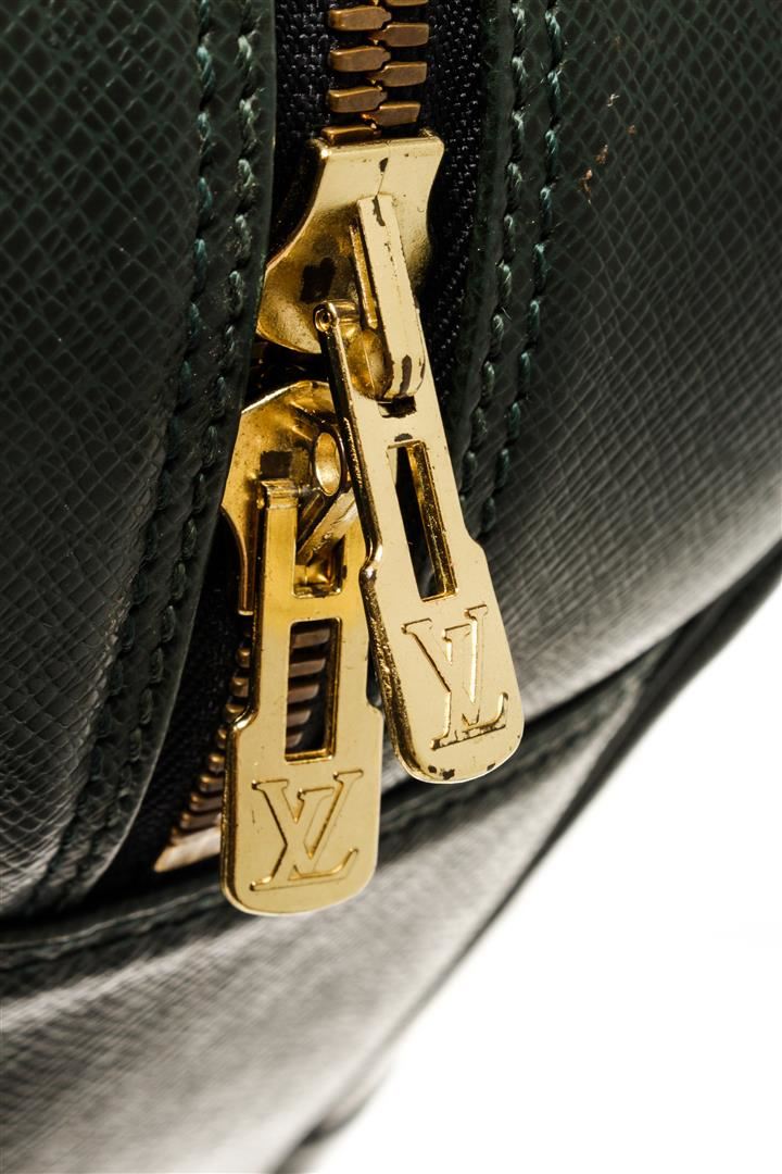 One Louis Vuitton Green Taiga Leather Helanga 1 Poche Bag. Item is sold AS-IS. All available information is listed in the description and shown in the photo. Louis Vuitton Green Taiga Leather Helanga 1 Poche Bag with gold tone hardware, green leather trim, brown suede lining, dual top handles, and zipper closure.