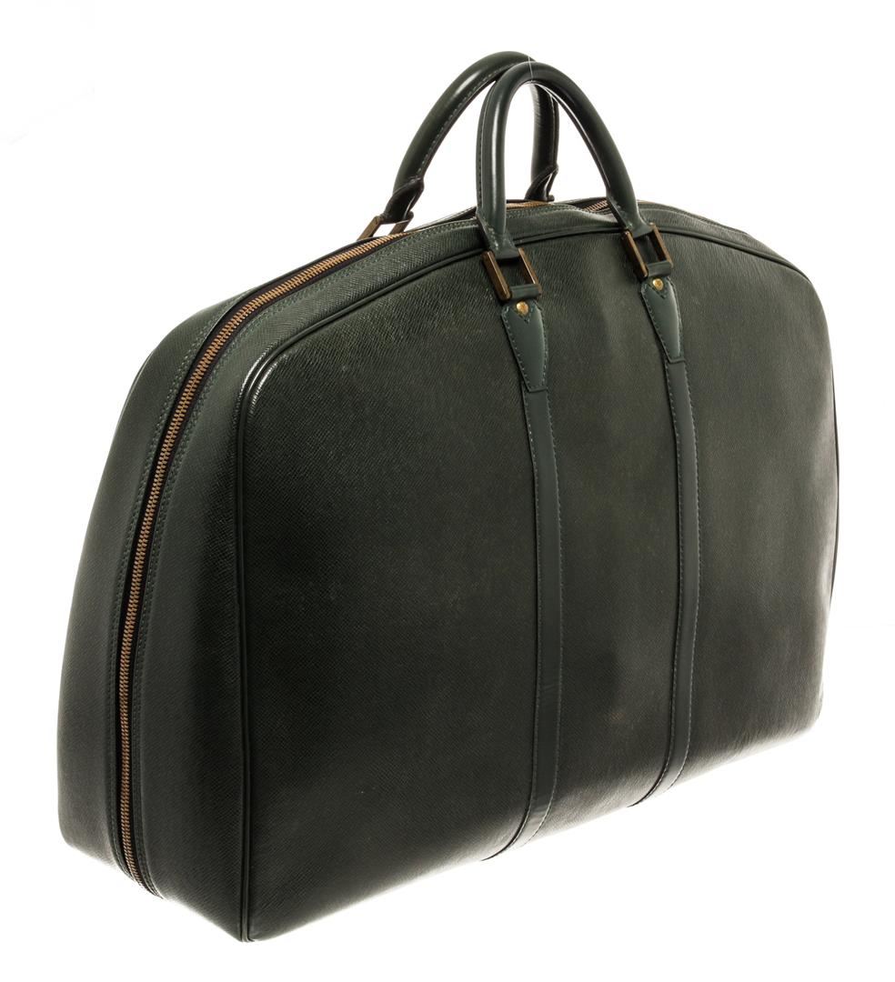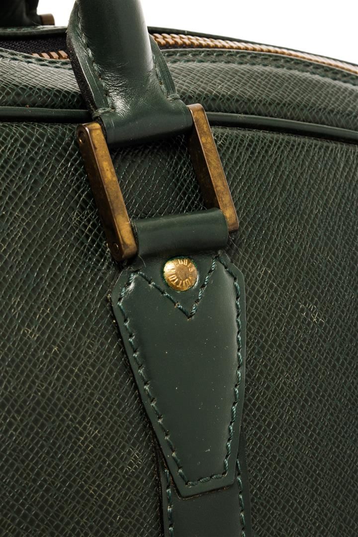 One Louis Vuitton Green Taiga Leather Helanga 1 Poche Bag. Item is sold AS-IS. All available information is listed in the description and shown in the photo. Louis Vuitton Green Taiga Leather Helanga 1 Poche Bag with gold tone hardware, green leather trim, brown suede lining, dual top handles, and zipper closure.