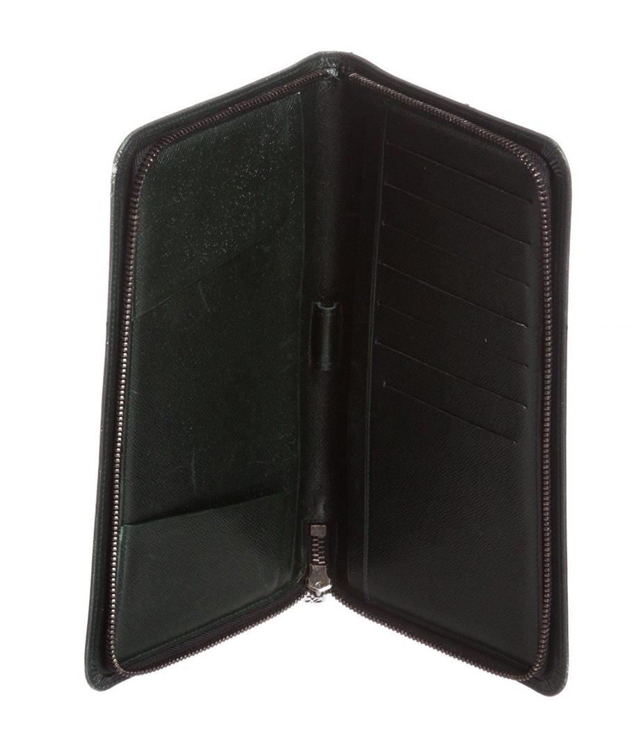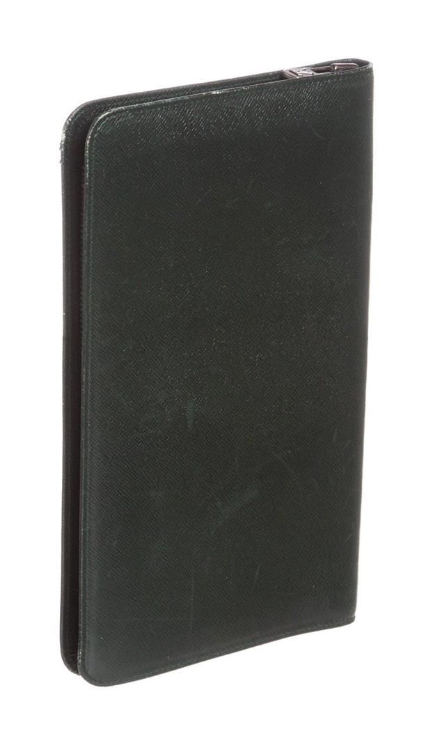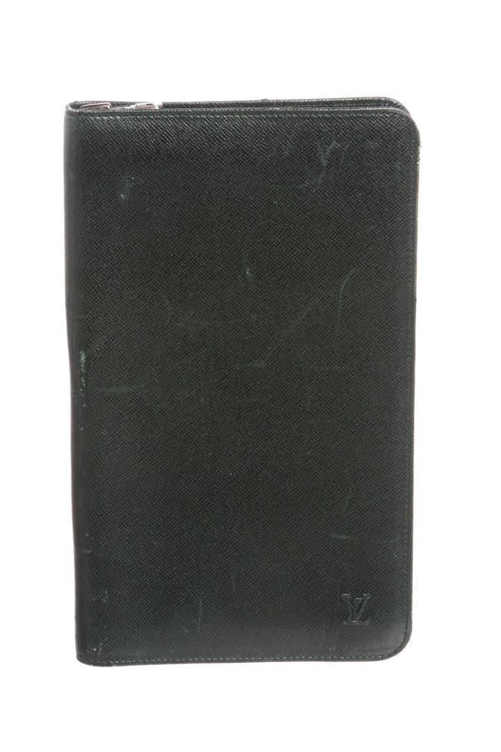 Green Taiga leather Louis Vuitton Porte Valeurs organizer with embossed logo at front, six card slots, dual bill compartments, dual slots at interior walls and fold-over closure.