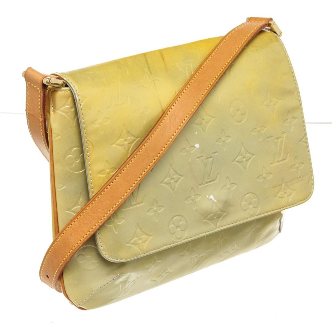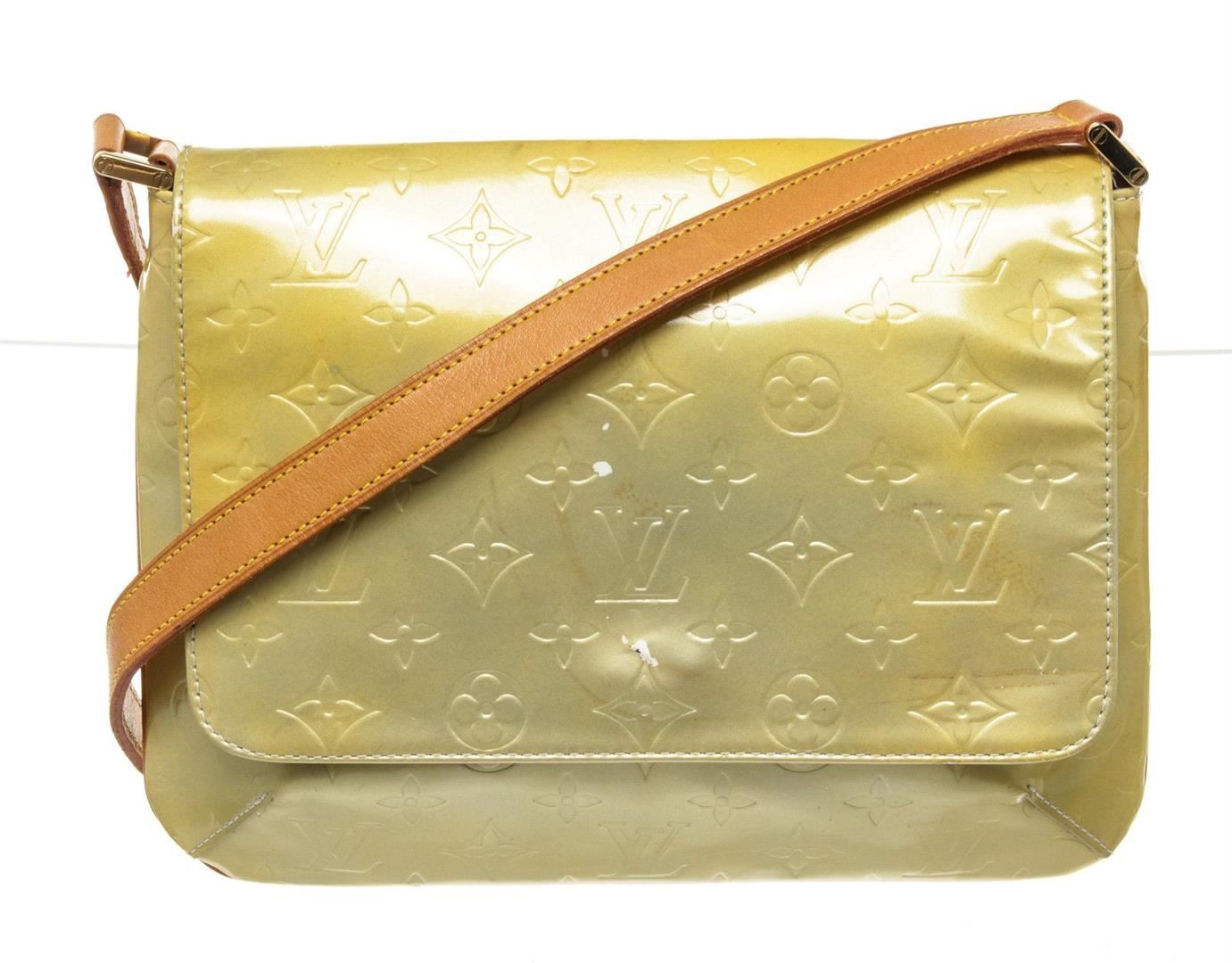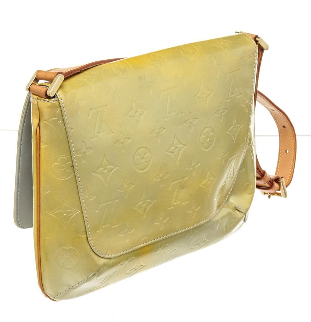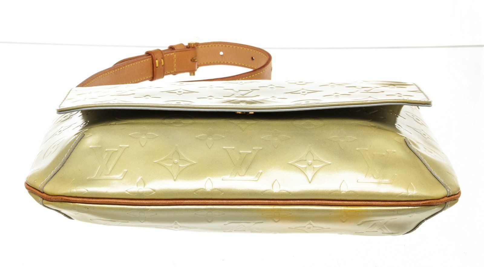Louis Vuitton Green Vernis Leather Thompson Street Shoulder Bag with vernis leather, gold-tone hardware, tan vachetta leather trim, shoulder strap and snap closure.