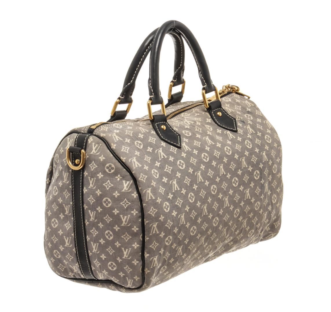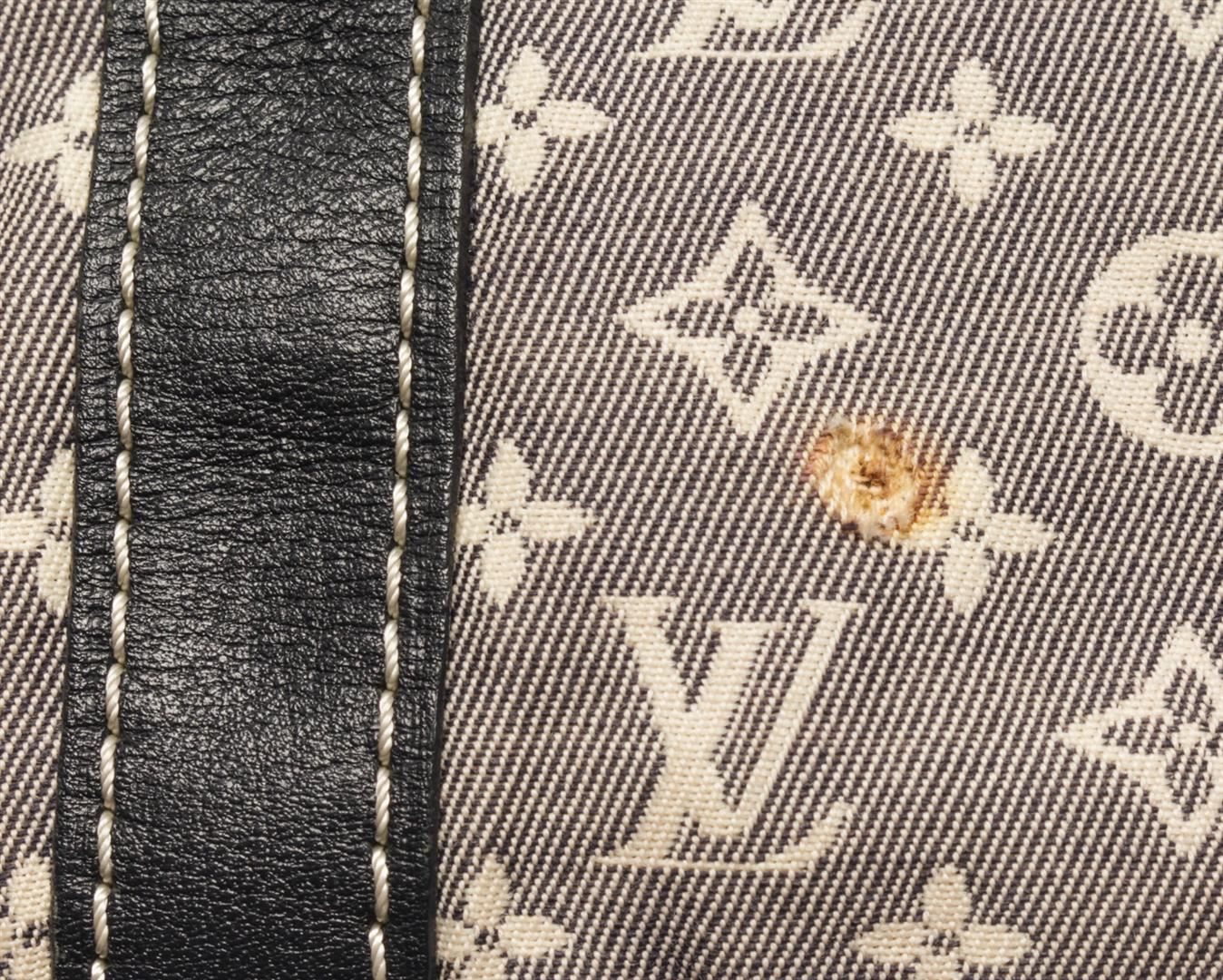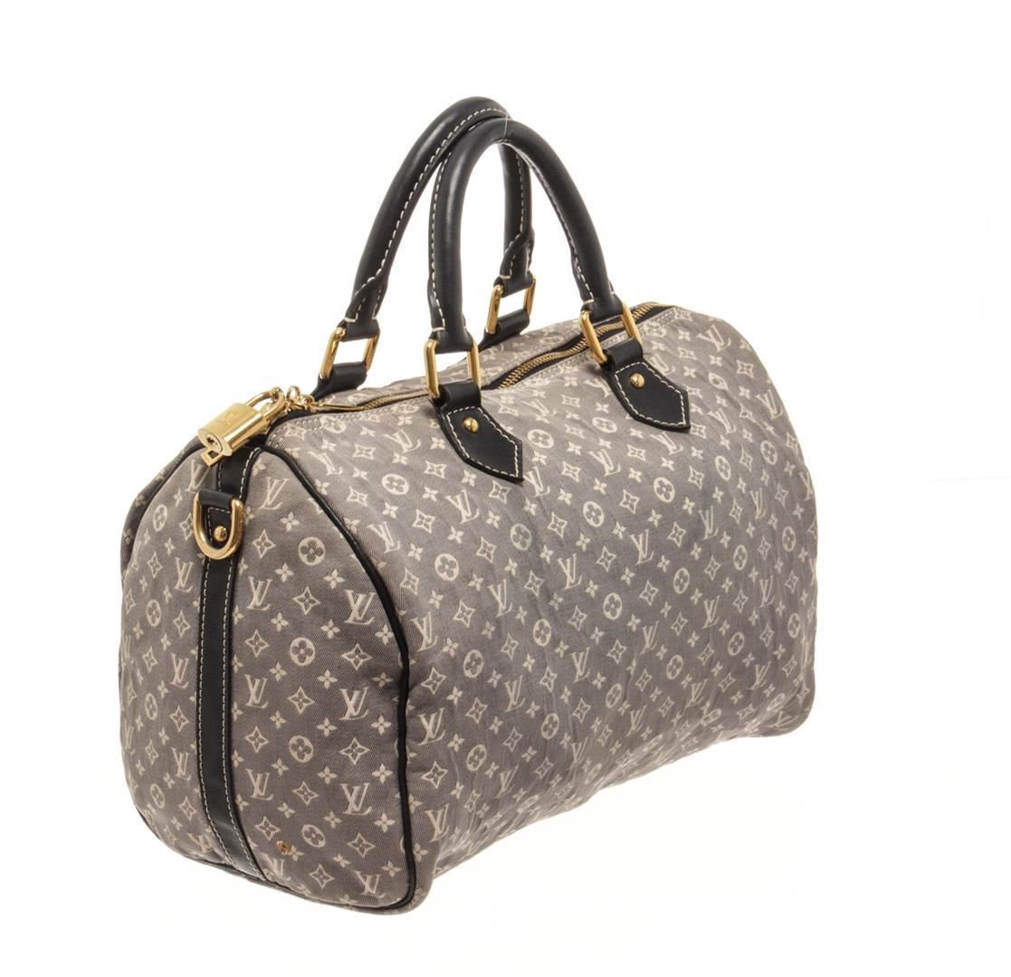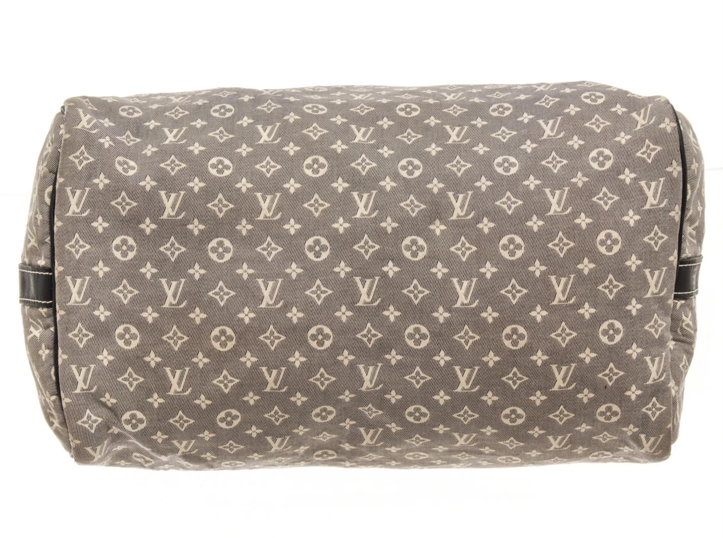 One Louis Vuitton Grey Monogram Mini Lin Speedy Bandouliere 30 Boston Bag. Item is sold AS-IS. All available information is listed in the description and shown in the photo. Louis Vuitton Grey Monogram Mini Lin Speedy Bandouliere 30 Boston Bag with blue top handle, gold tone hardware, zipper closure, lock and fabric lining. This does not come with a strap, the lining is stained, there is a burn whole on the exterior fabric. Please refer to photos. Dimensions: 20.5cm x 30.5cm x 18cm / 8.07" X 12.00" X 7.08" Inches