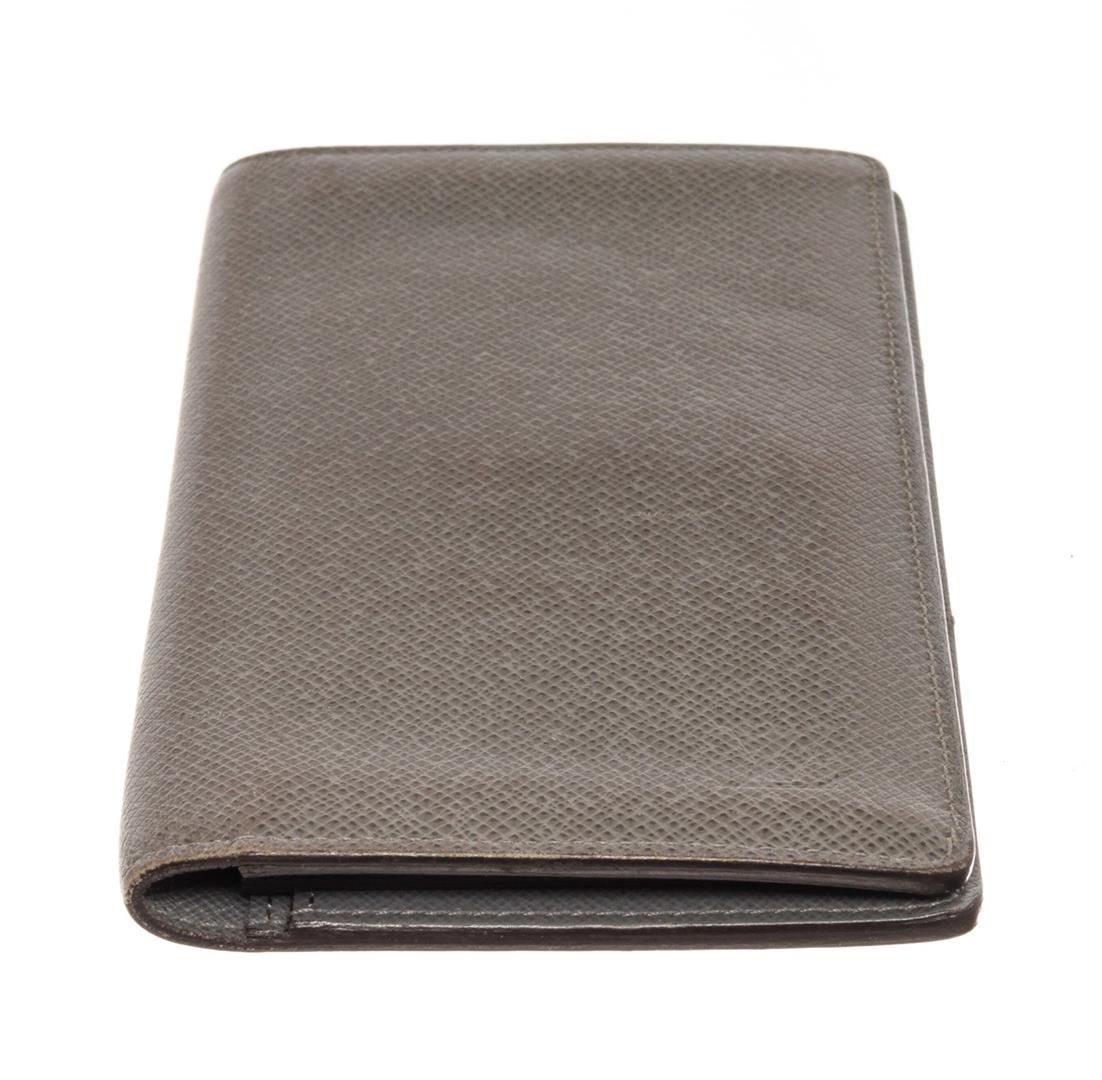 Louis Vuitton Grey Taiga Leather Brazza Wallet with leather, gold-tone hardware, trim tan vachetta leather, interior card holder pocket, leather lining and flap closure.