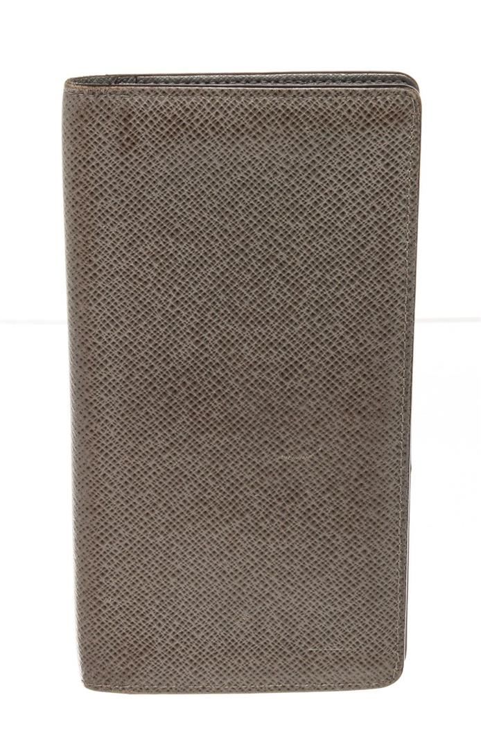 Louis Vuitton Grey Taiga Leather Brazza Wallet with leather, gold-tone hardware, trim tan vachetta leather, interior card holder pocket, leather lining and flap closure.