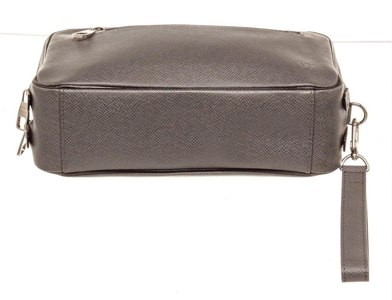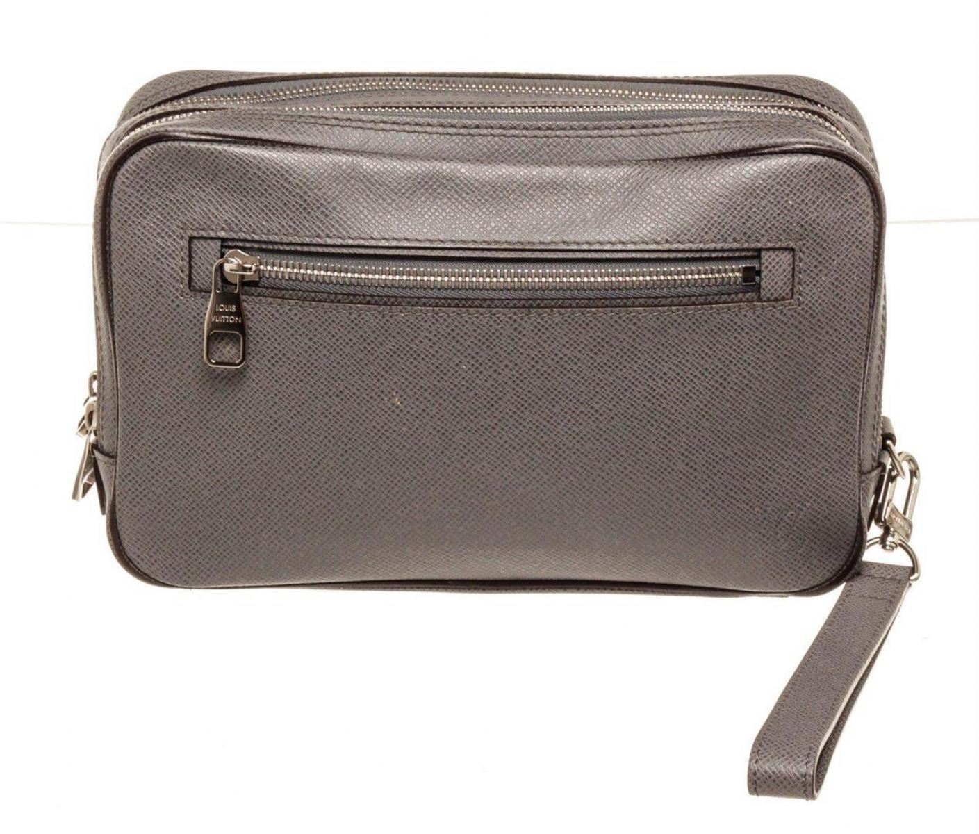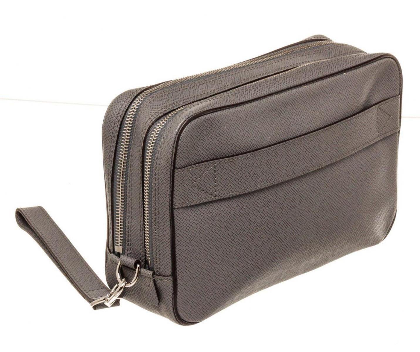Louis Vuitton Grey Taiga Leather Neo Pavel Clutch Bag with material leather, silver-tone hardware, exterior zip pocket, interior slip pocket, and zipper closure.