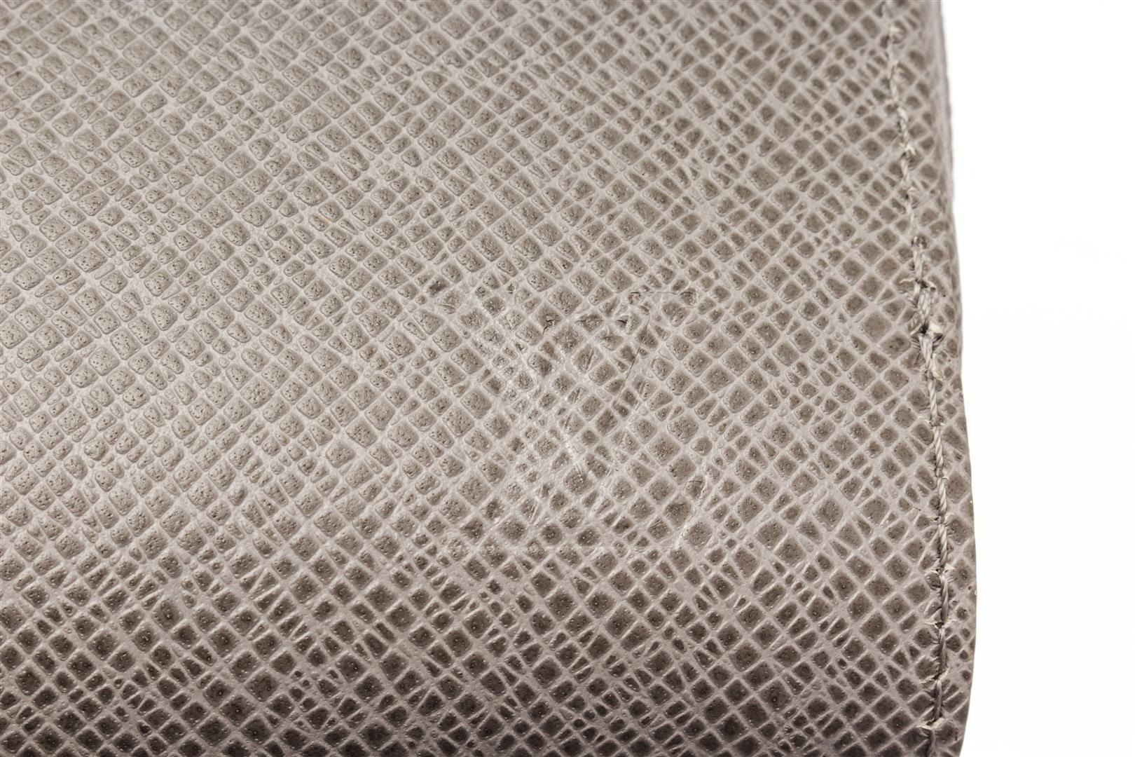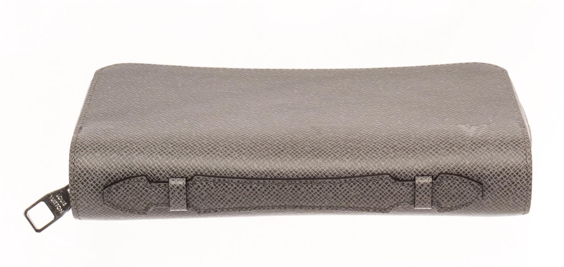 Louis Vuitton Grey Taiga Leather XL Zippy Wallet. All available information is listed in the description and shown in the photos. Louis Vuitton Grey Taiga Leather XL Zippy Wallet with gold-tone hardware, trim tan vachetta leather, slip pocket in interior, zip around closure opens to card slots, Zip around closure.