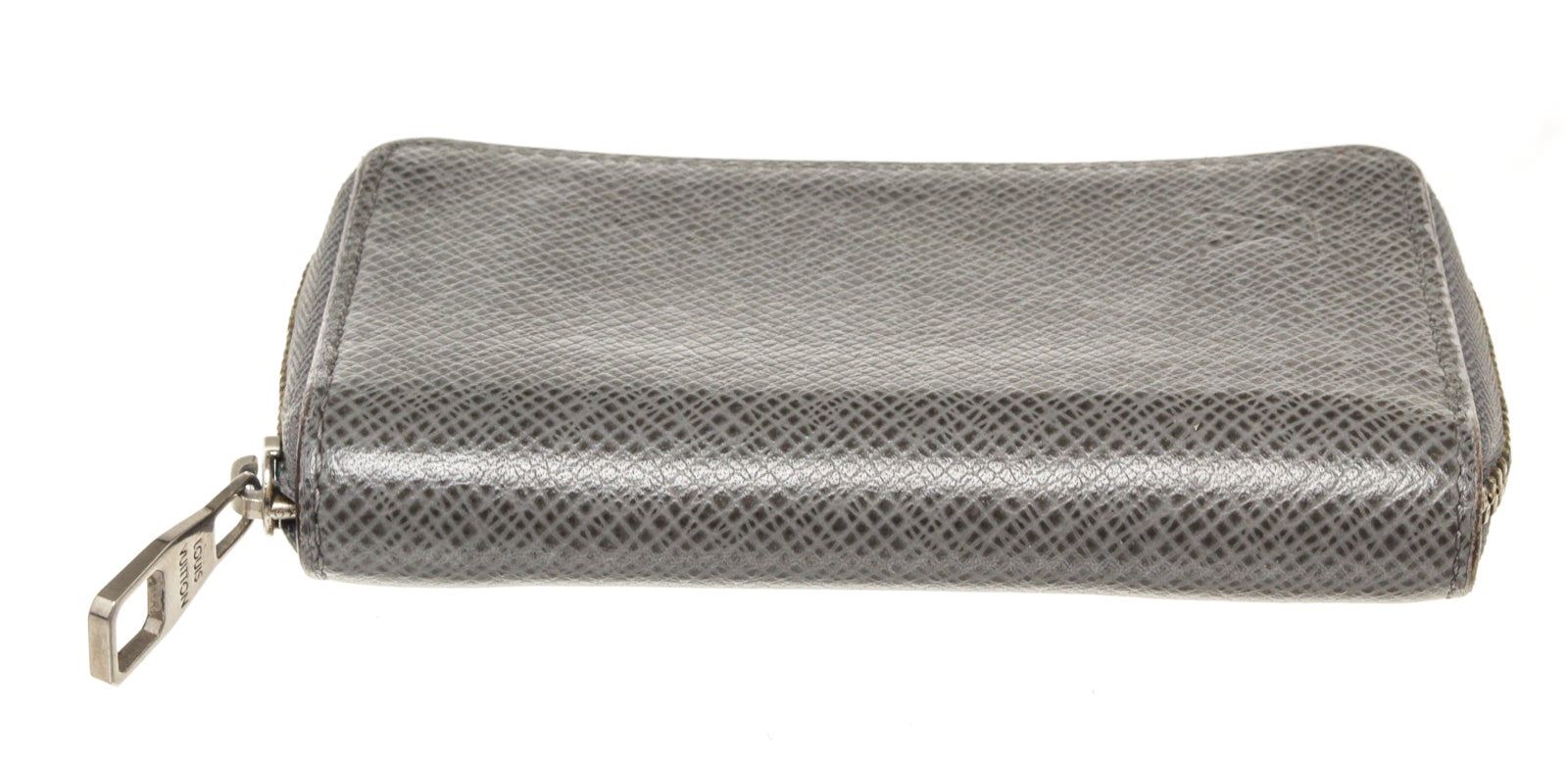 Louis Vuitton Grey Taiga Leather Zippy Coin Purse Wallet with taiga leather, silver-tone hardware, tan vachetta leather trim, interior flap pockets, leather lining, zip closure.