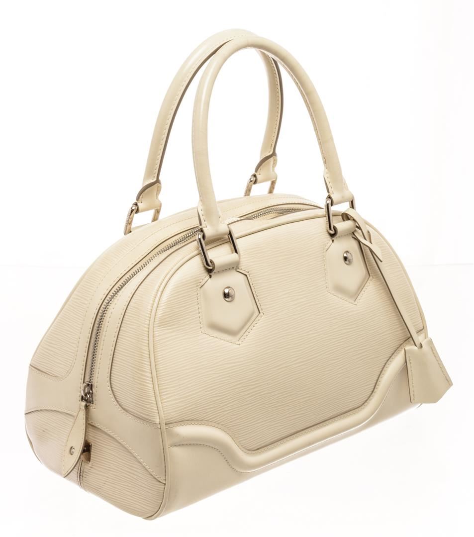 Louis Vuitton Ivory White Epi Leather Bowling Montaigne BB Tote Bag. All available information is listed in the description and shown in the photos. Louis Vuitton Ivory White Epi Leather Bowling Montaigne BB Tote Bag with signature epi texture, silver-tone hardware, leather key fob, metal feet, top zip fastening, two rounded top handles, internal slip pocket, internal logo patch, full lining. Condition Details: Some surface scuffing and wear on bottom and corners. Depth 7.1 in, Height 9.1 in, Width 13 in, Handle 6 in / Depth 18.034 cm, Height 23.114 cm, Width 33.02 cm, Handle 15.24 cm