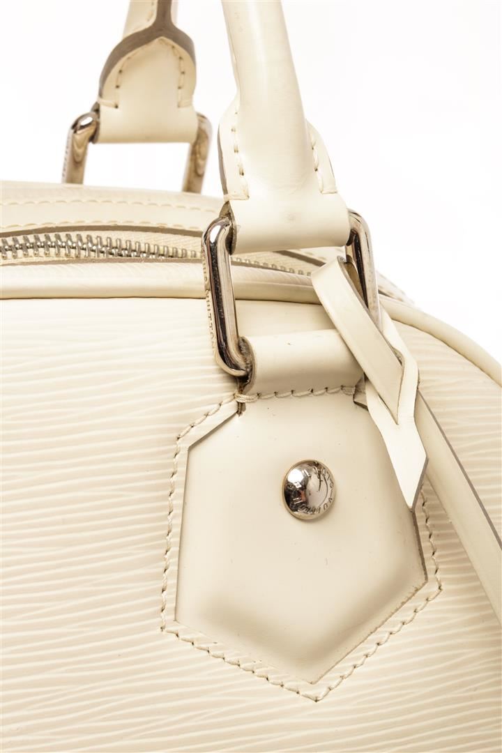 Louis Vuitton Ivory White Epi Leather Bowling Montaigne BB Tote Bag. All available information is listed in the description and shown in the photos. Louis Vuitton Ivory White Epi Leather Bowling Montaigne BB Tote Bag with signature epi texture, silver-tone hardware, leather key fob, metal feet, top zip fastening, two rounded top handles, internal slip pocket, internal logo patch, full lining. Condition Details: Some surface scuffing and wear on bottom and corners. Depth 7.1 in, Height 9.1 in, Width 13 in, Handle 6 in / Depth 18.034 cm, Height 23.114 cm, Width 33.02 cm, Handle 15.24 cm