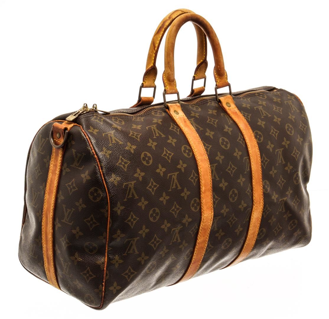 One Louis Vuitton Keepall 45 cm Bandouliere Duffel Bag. Item is sold AS-IS. All available information is listed in the description and shown in the photo. Louis Vuitton Keepall 45 cm Bandouliere duffel bag with monogram coated canvas exterior, contrasting vanchetta leather trims and top handles, brown fabric lining, adjustable and detachable strap, top zipper closure, and gold-tone hardware.