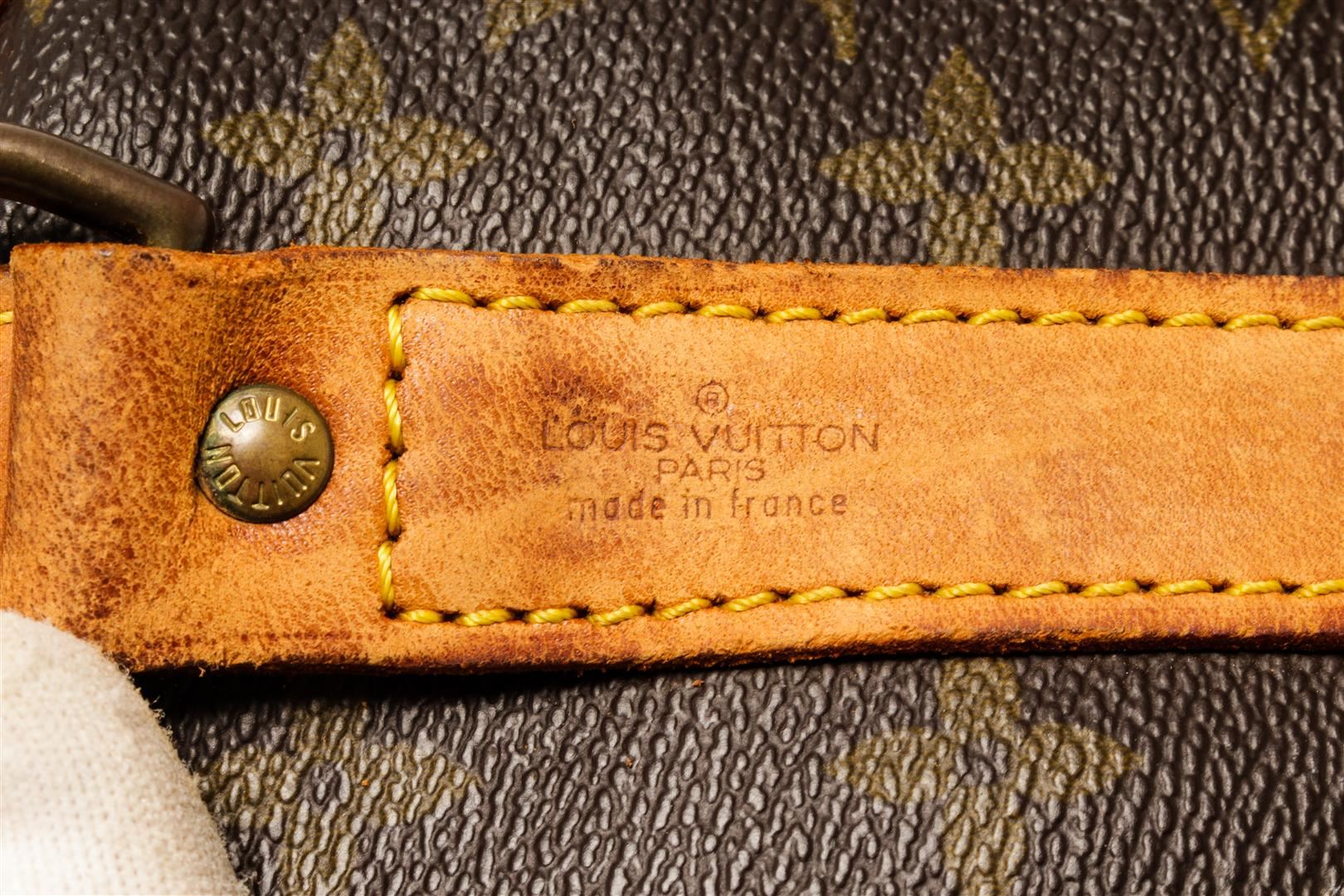 One Louis Vuitton Keepall 45 cm Bandouliere Duffel Bag. Item is sold AS-IS. All available information is listed in the description and shown in the photo. Louis Vuitton Keepall 45 cm Bandouliere duffel bag with monogram coated canvas exterior, contrasting vanchetta leather trims and top handles, brown fabric lining, adjustable and detachable strap, top zipper closure, and gold-tone hardware.