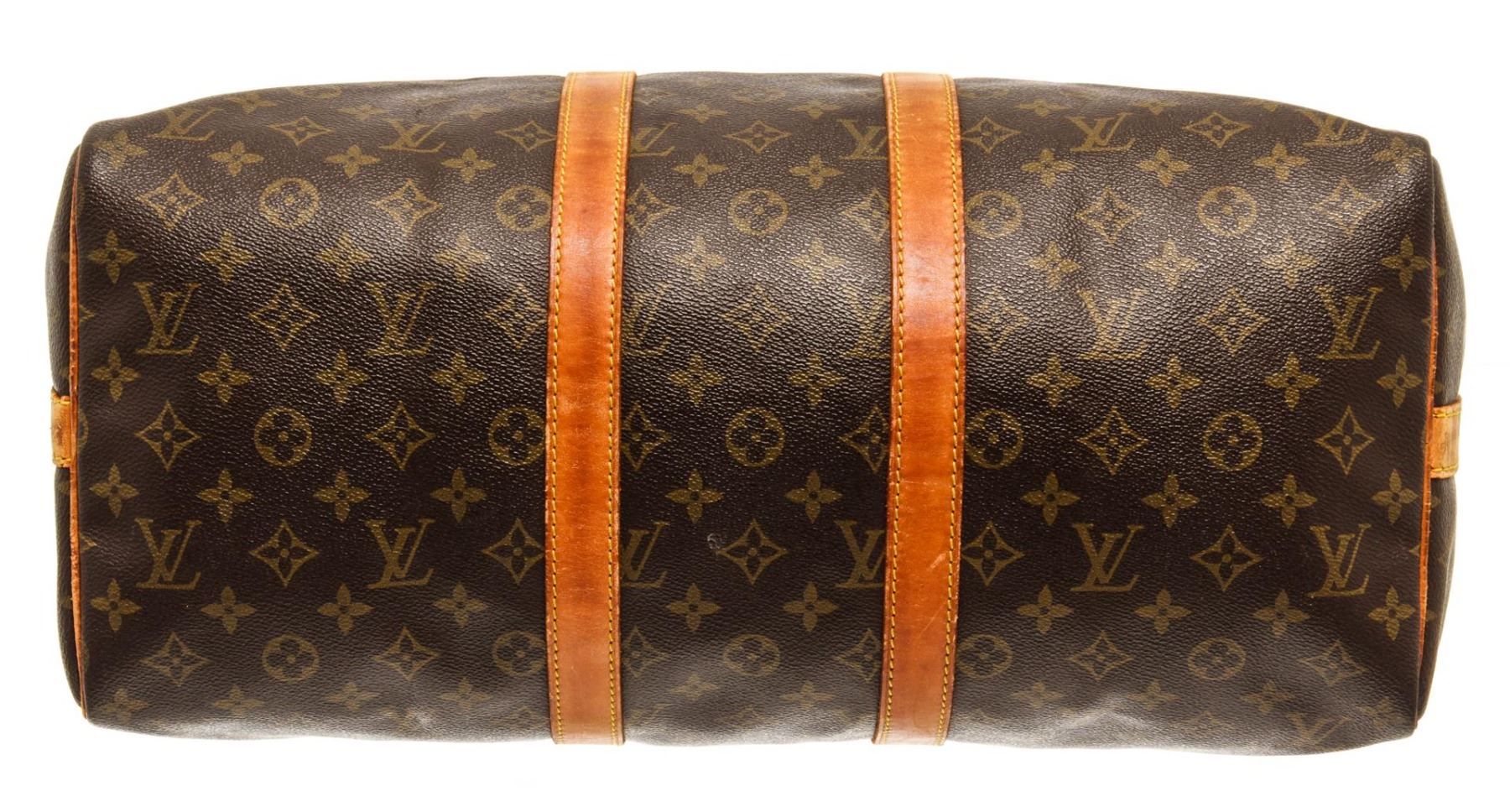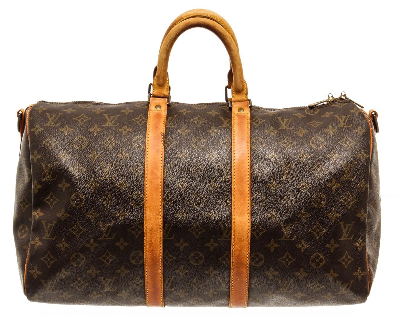One Louis Vuitton Keepall 45 cm Bandouliere Duffel Bag. Item is sold AS-IS. All available information is listed in the description and shown in the photo. Louis Vuitton Keepall 45 cm Bandouliere duffel bag with monogram coated canvas exterior, contrasting vanchetta leather trims and top handles, brown fabric lining, adjustable and detachable strap, top zipper closure, and gold-tone hardware.