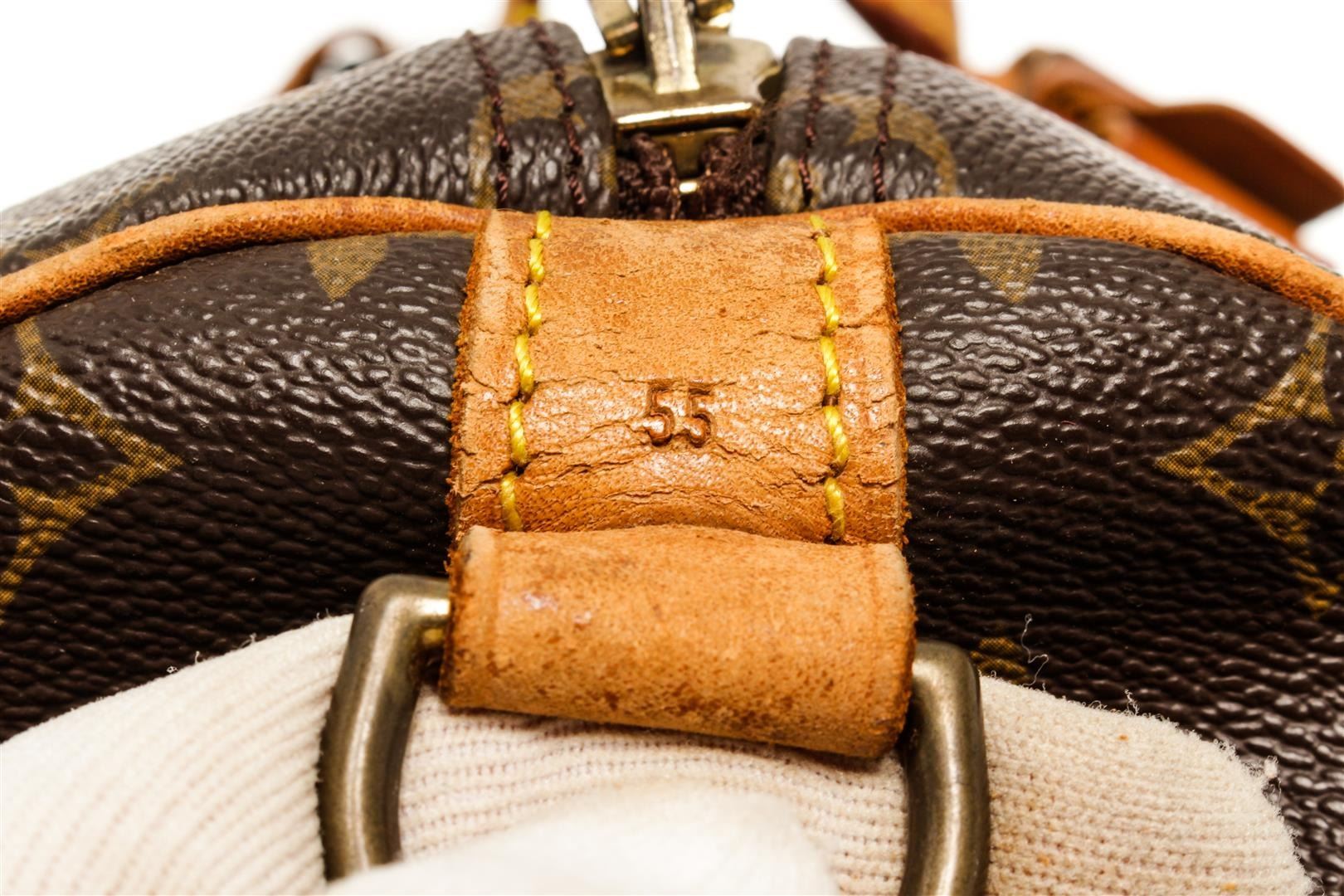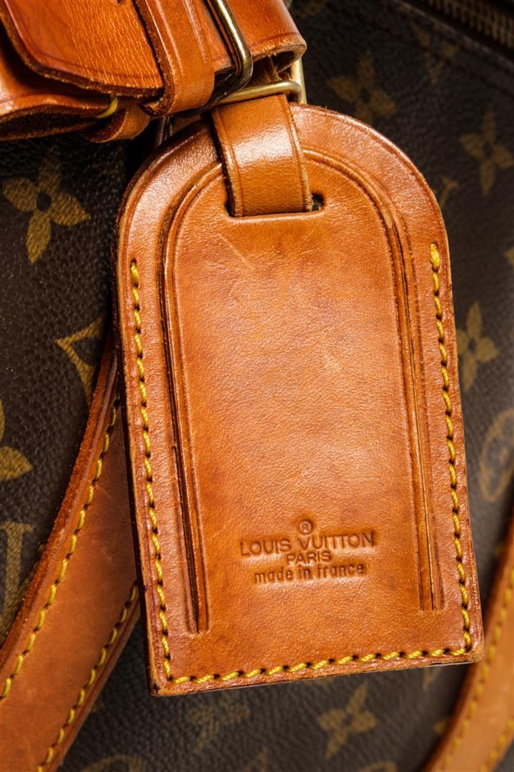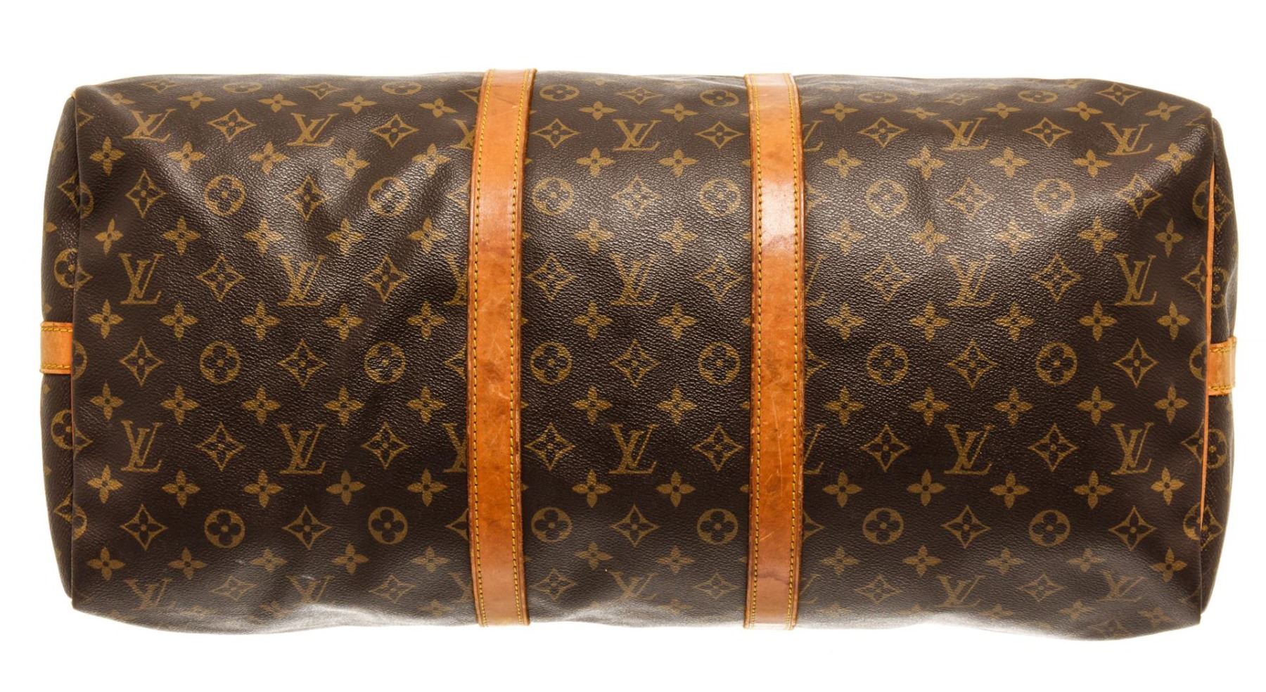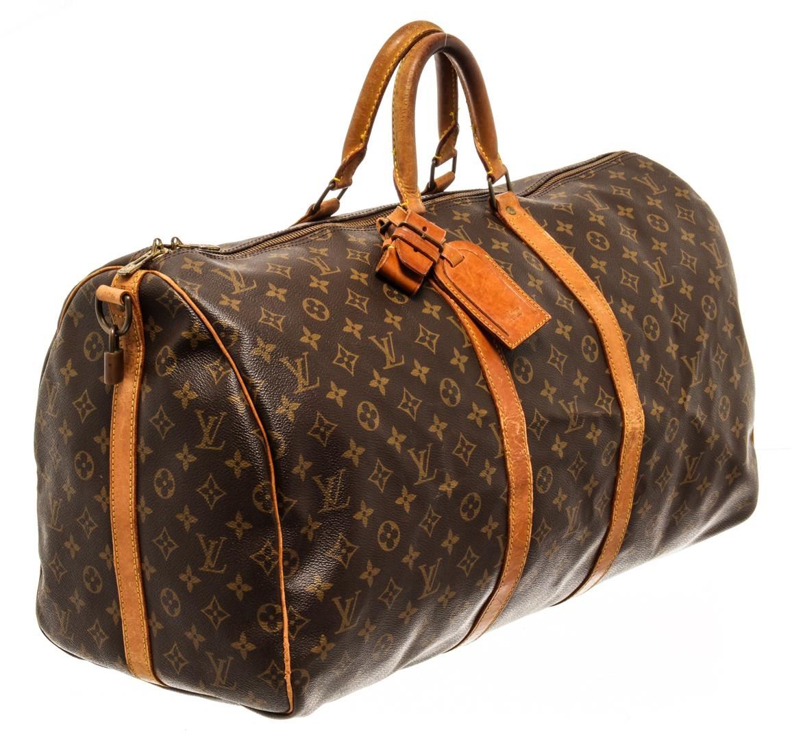 One Louis Vuitton Keepall 55 cm Duffel Bag. Item is sold AS-IS. All available information is listed in the description and shown in the photo. Louis Vuitton Keepall 55 cm duffel bag with monogram coated canvas exterior, contrasting vanchetta leather trims and top handles, top zipper closure, gold-tone hardware, brown fabric lining, and luggage tag.