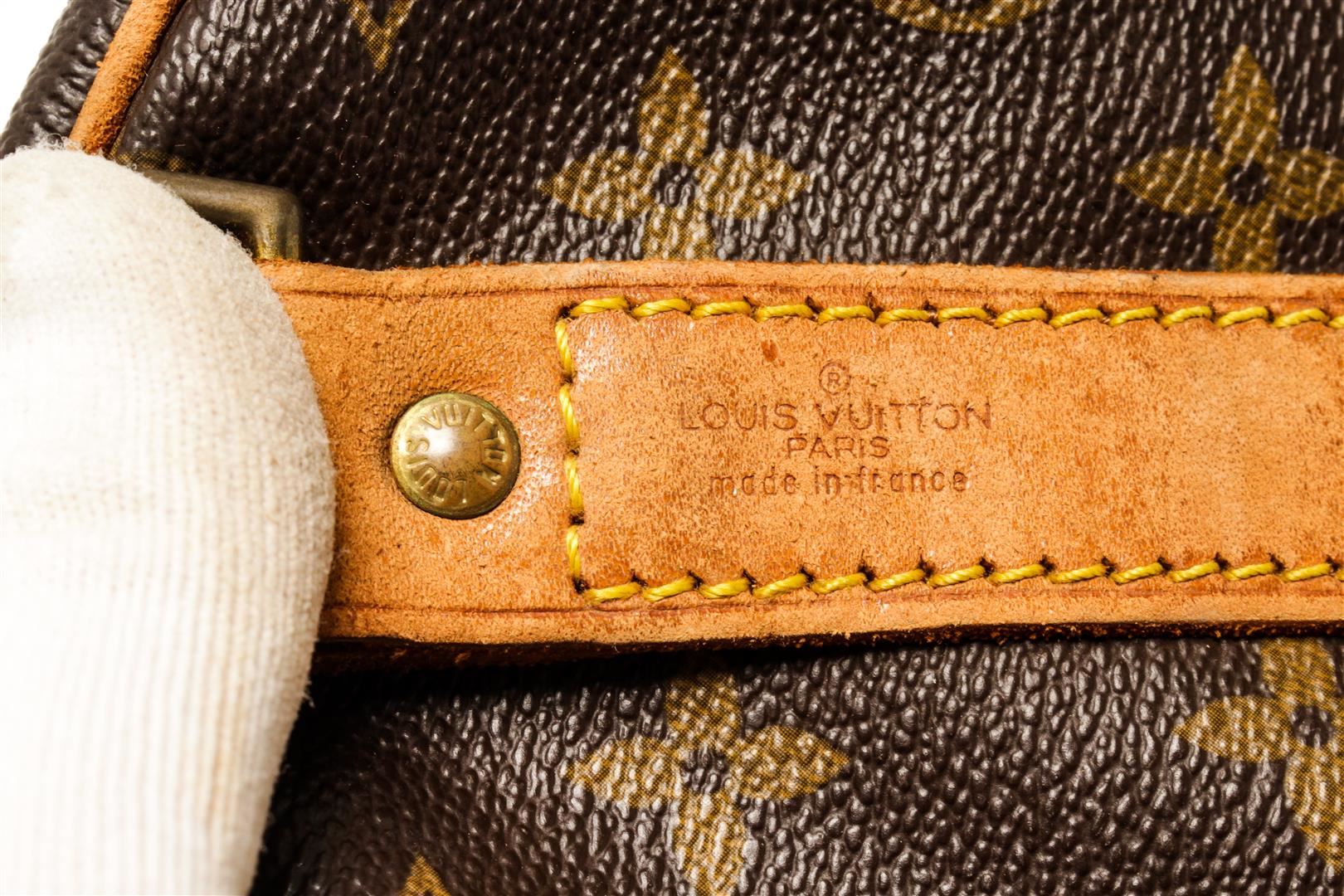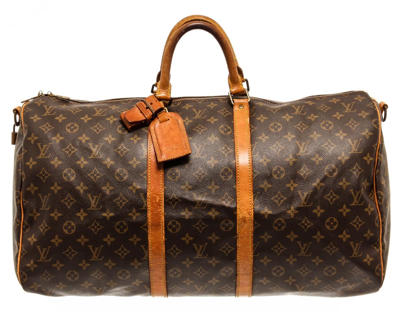 One Louis Vuitton Keepall 55 cm Duffel Bag. Item is sold AS-IS. All available information is listed in the description and shown in the photo. Louis Vuitton Keepall 55 cm duffel bag with monogram coated canvas exterior, contrasting vanchetta leather trims and top handles, top zipper closure, gold-tone hardware, brown fabric lining, and luggage tag.