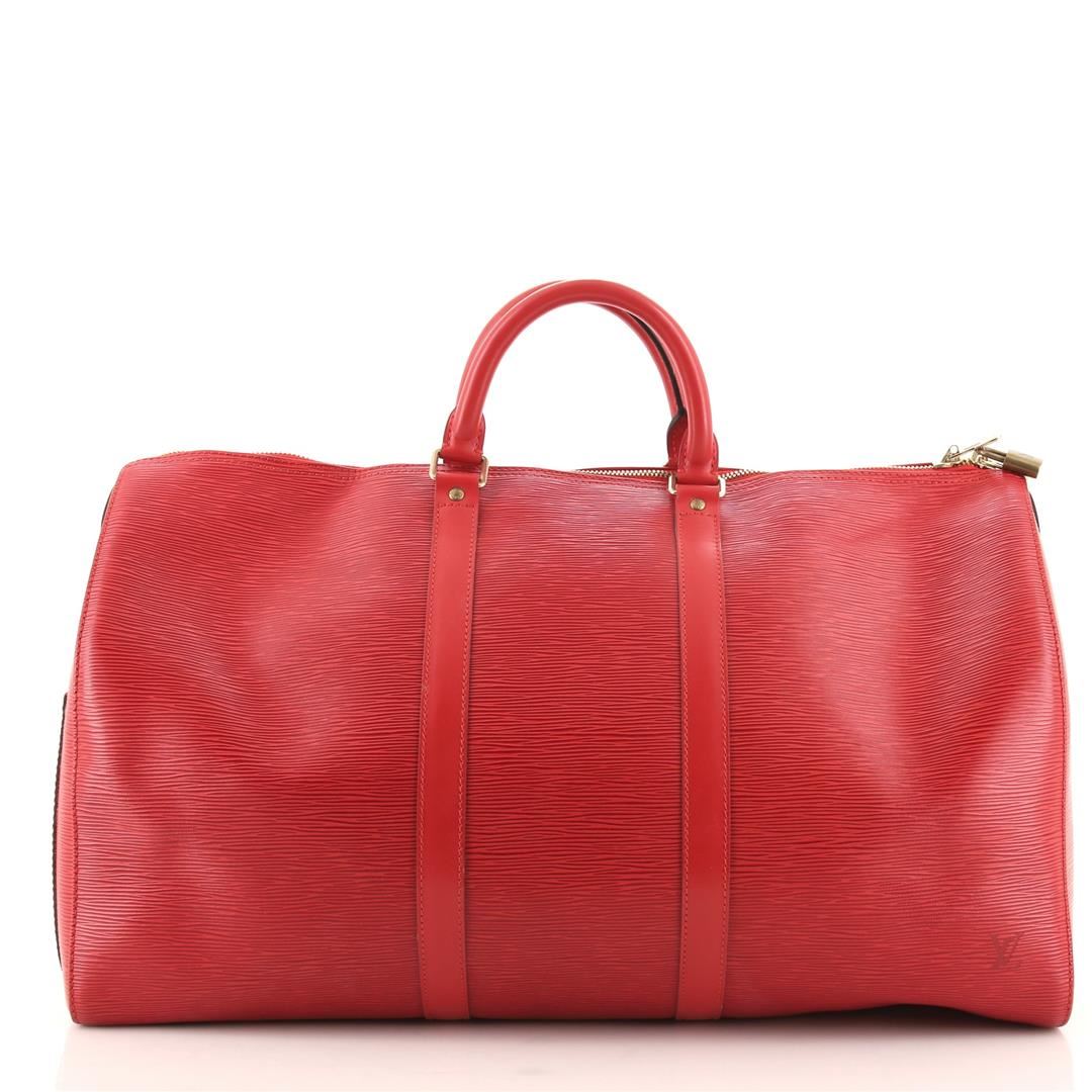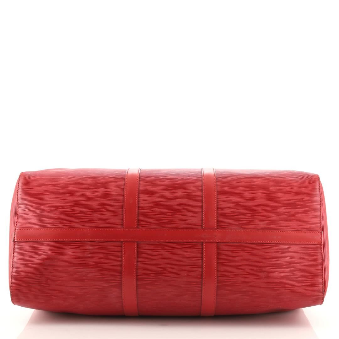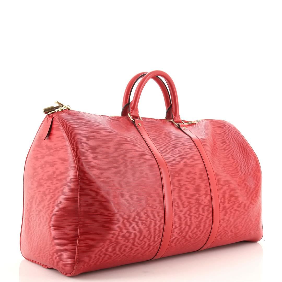 Louis Vuitton Keepall Bag Epi Leather 50. Heavy darkening and wear on base corners, creasing, wear, scuffs and marks on exterior and handles. Cracking on handle wax edges, wear, darkening, scuffs and heavy stains in interior, scratches and tarnish on hard