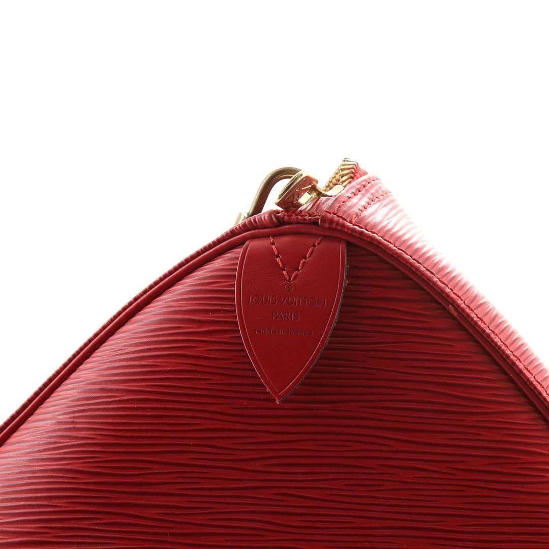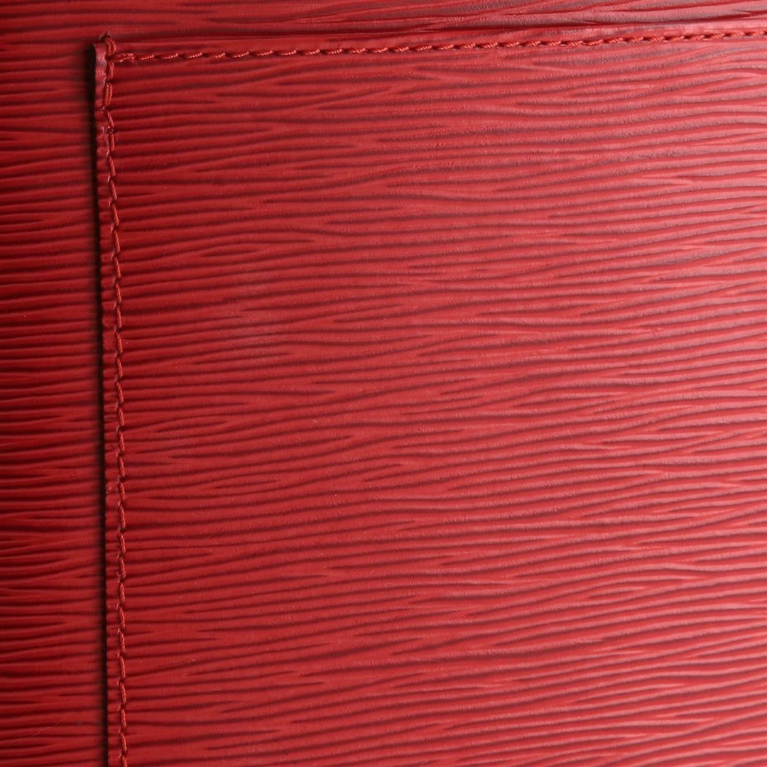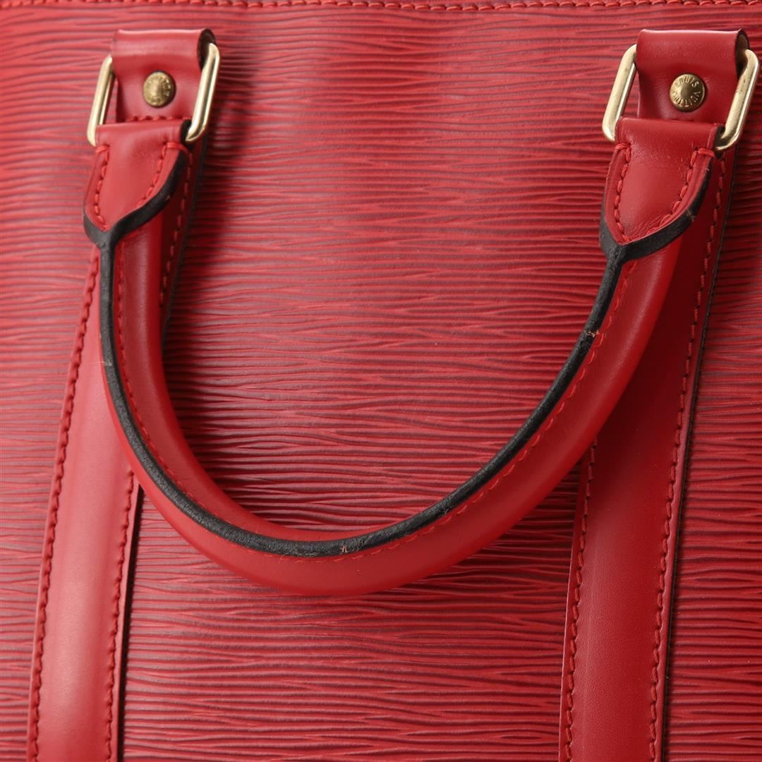 Louis Vuitton Keepall Bag Epi Leather 50. Heavy darkening and wear on base corners, creasing, wear, scuffs and marks on exterior and handles. Cracking on handle wax edges, wear, darkening, scuffs and heavy stains in interior, scratches and tarnish on hard