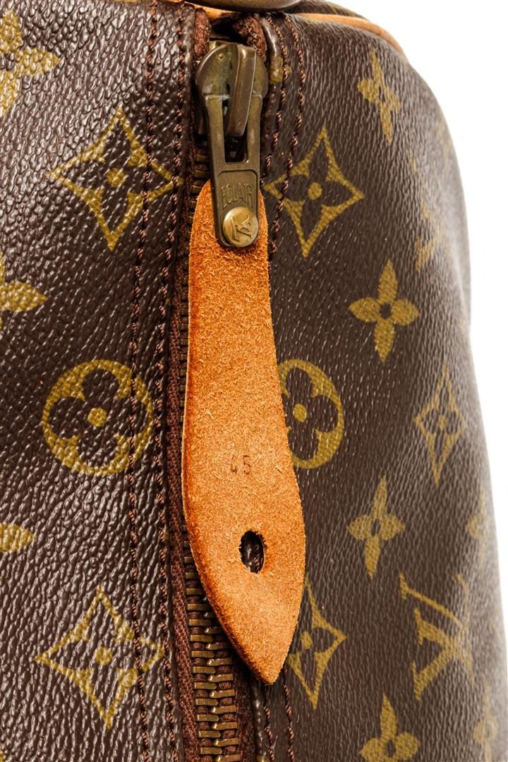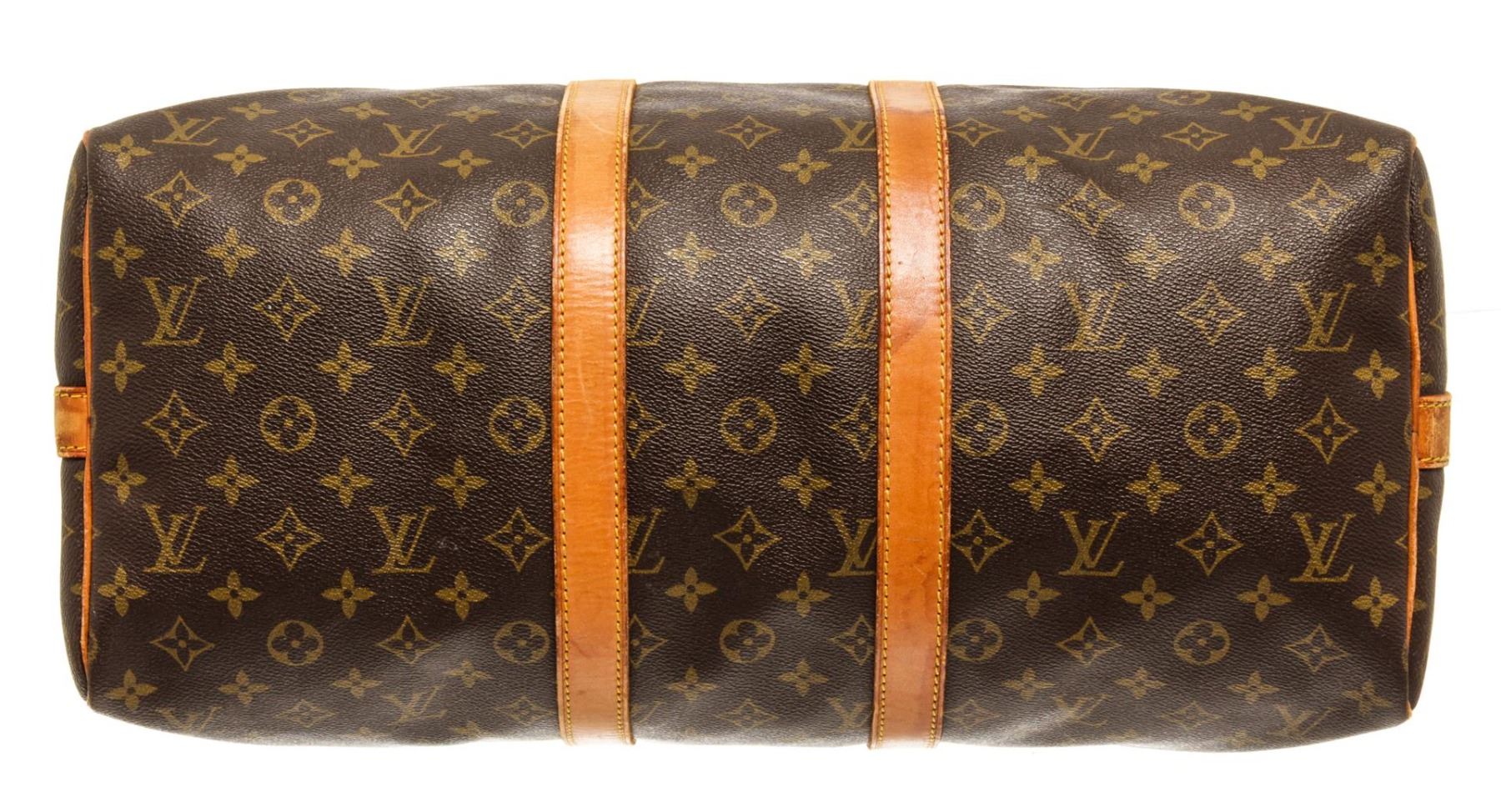 One Louis Vuitton Keepall Bandouliere 45 cm Duffel Bag. Item is sold AS-IS. All available information is listed in the description and shown in the photo. Louis Vuitton Keepall Bandouliere 45 cm duffel bag with monogram coated canvas exterior, contrasting vanchetta leather trims and top handles, brown fabric lining, top zipper closure, lock, gold-tone hardware, and adjustable and detachable strap.