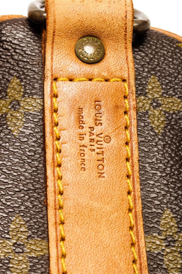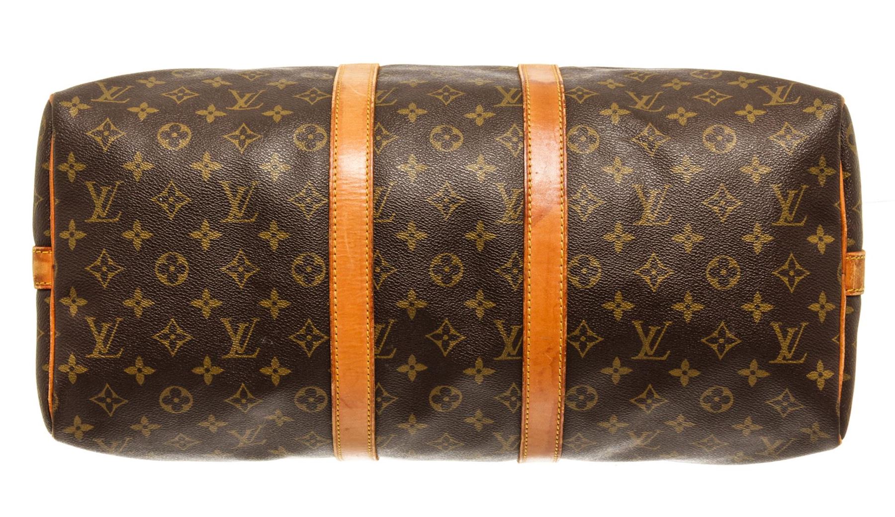 One Louis Vuitton Keepall Bandouliere 45 cm Duffel Bag. Item is sold AS-IS. All available information is listed in the description and shown in the photo. Louis Vuitton Keepall Bandouliere 45 cm duffel bag with monogram coated canvas exterior, contrasting vanchetta leather trims and top handles, brown fabric lining, top zipper closure, lock, gold-tone hardware, and adjustable and detachable strap.