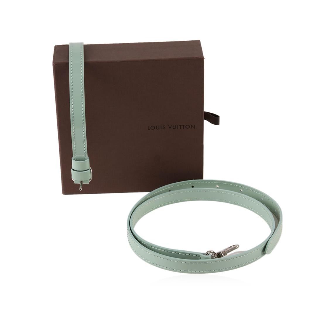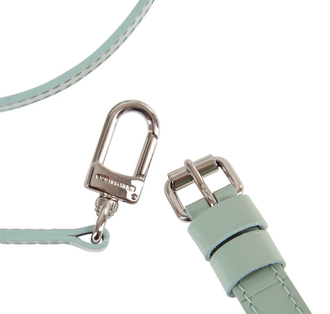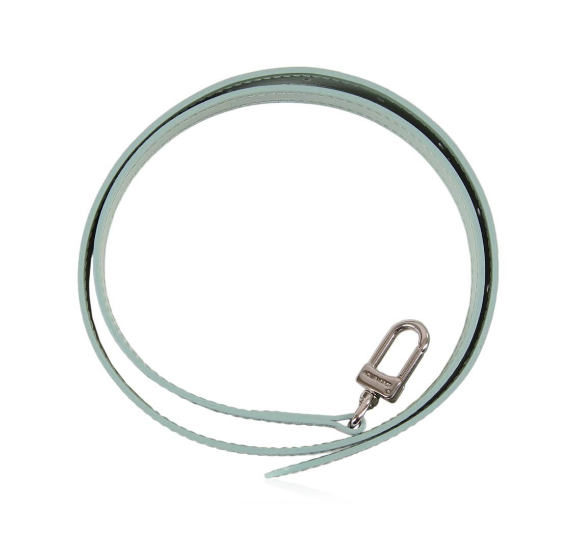 One set of Louis Vuitton light blue leather replacement straps in good condition, measuring approximately 5/8 inches wide. The smaller strap measures approximately 13 inches long with clasps and the larger is adjustable with a total length of approximately 38.5 inches. Comes with a Louis Vuitton drawstring cover bag and box.