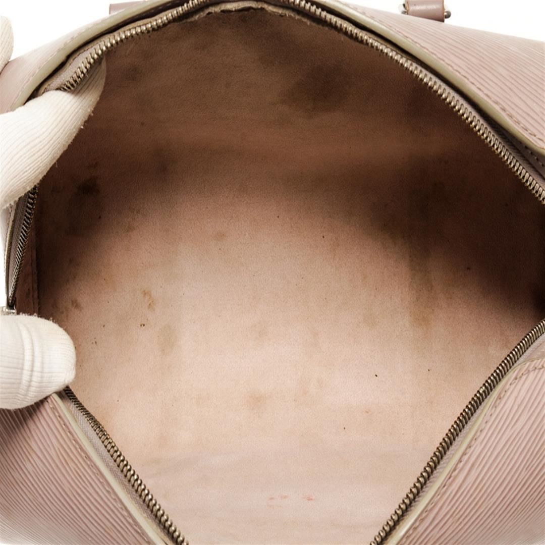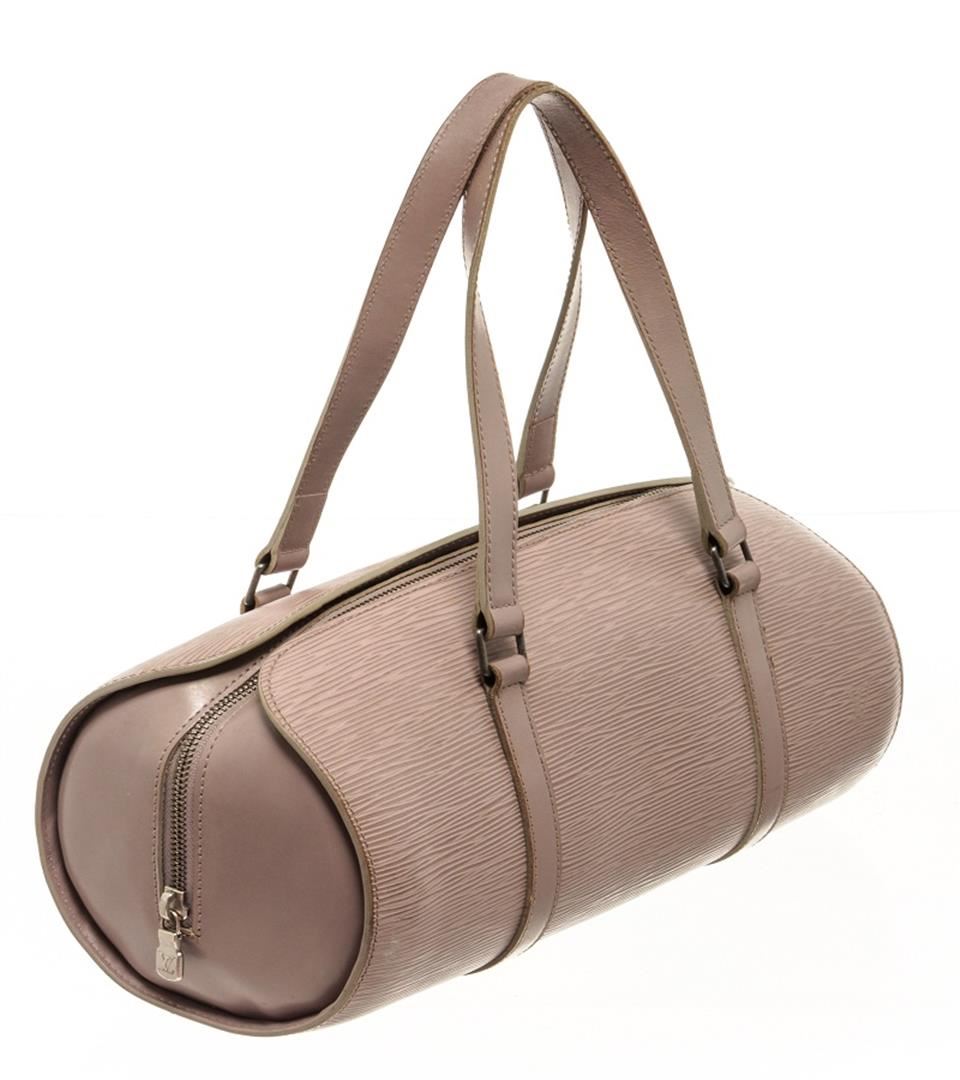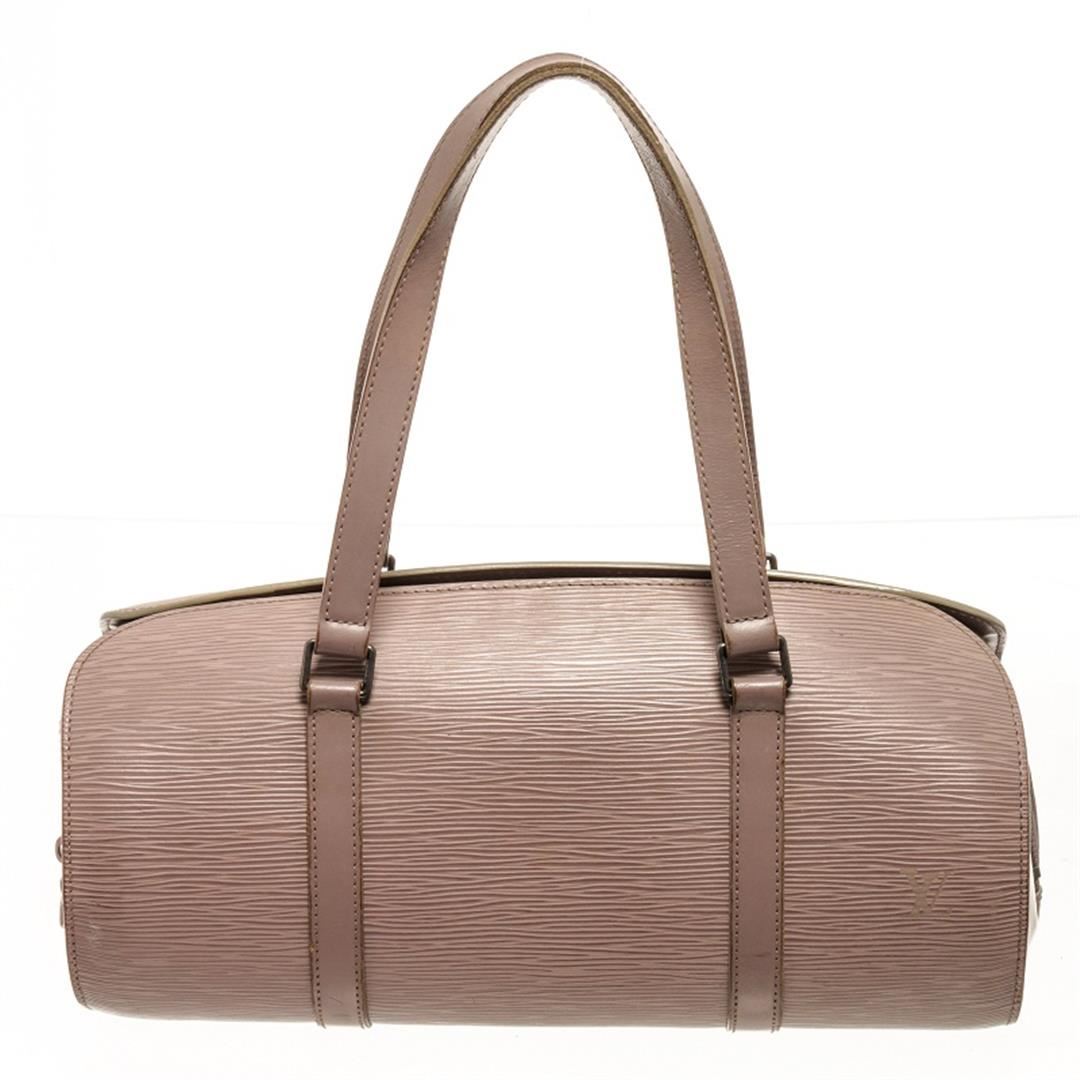 One Louis Vuitton Lilac Epi Soufflot Bag. Item is sold AS-IS. All available information is listed in the description and shown in the photo. Louis Vuitton lilac epi leather Soufflot bag with beige suede lining, smooth lilac leather straps, silver-toned hardware, zip closure, and one interior slip pocket. Bottom of bag is marked as shown in pictuers. Height: 5.91" Width: 12.2" Depth: 5.51" , Handle Drop: 5.91" / 15 x 31 x 14 Cm
