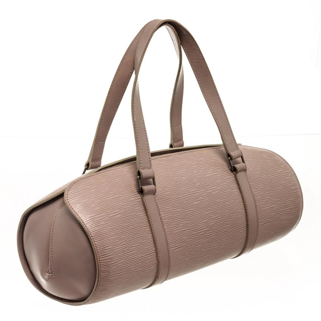 One Louis Vuitton Lilac Epi Soufflot Bag. Item is sold AS-IS. All available information is listed in the description and shown in the photo. Louis Vuitton lilac epi leather Soufflot bag with beige suede lining, smooth lilac leather straps, silver-toned hardware, zip closure, and one interior slip pocket. Bottom of bag is marked as shown in pictuers. Height: 5.91" Width: 12.2" Depth: 5.51", Handle Drop: 5.91" / 15 x 31 x 14 Cm