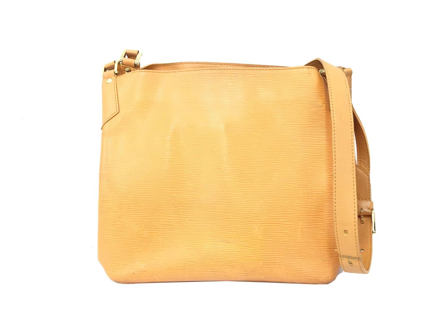 Mandarin Epi leather Louis Vuitton Mandara MM shoulder bag with gold-tone hardware, single flat shoulder strap with dual buckle adjustments, tonal woven interior lining, three interior compartments; one with zip closure, single slip pocket at interior wal