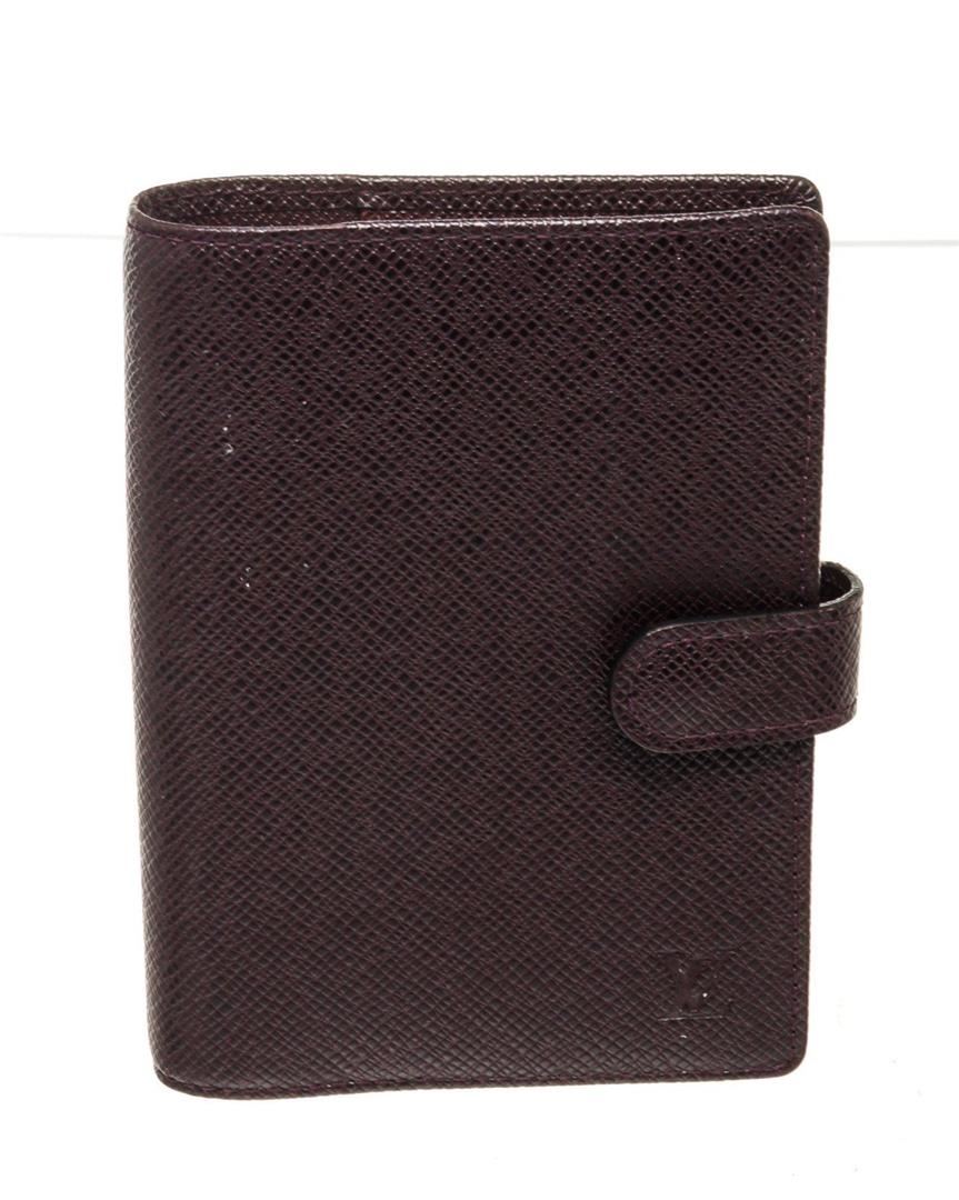 Louis Vuitton Maroon Taiga Leather Agenda PM Wallet with taiga leather, silver-tone hardware, interior flap pockets, leather lining, snap closure.