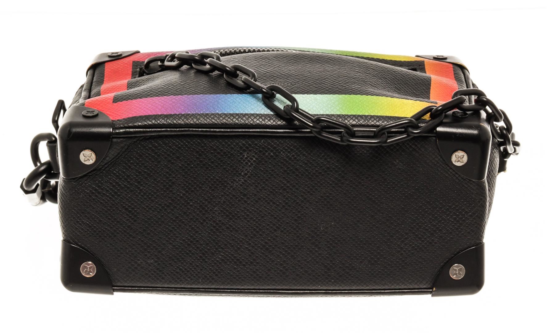 One Louis Vuitton Mini Black Rainbow Taiga Leather Soft trunk Shoulder Bag. Item is sold AS-IS. All available information is listed in the description and shown in the photo. louis vuitton mini black rainbow taiga leather soft trunk shoulder bag with gunmetal-tone hardware, adjustable detachable shoulder strap, front zip-fastening pocket, internal logo patch, full lining, metal corner protectors, zip closure. Depth 2.8 in, Height 4.7 in, Strap 22.4 in, Width 7.5 in / D7.11 x H11.93 x Strap: 56.89 x W19.05 cm
