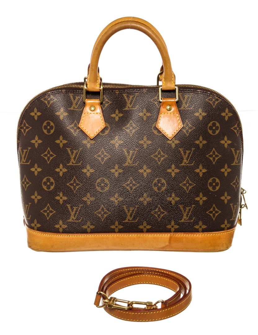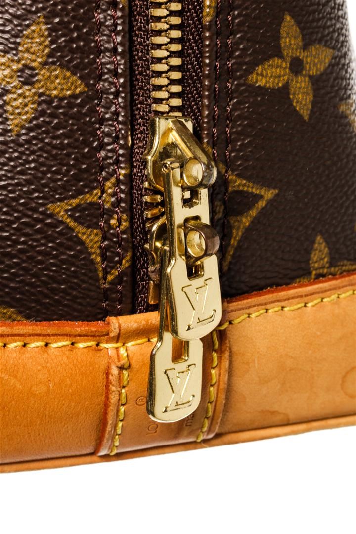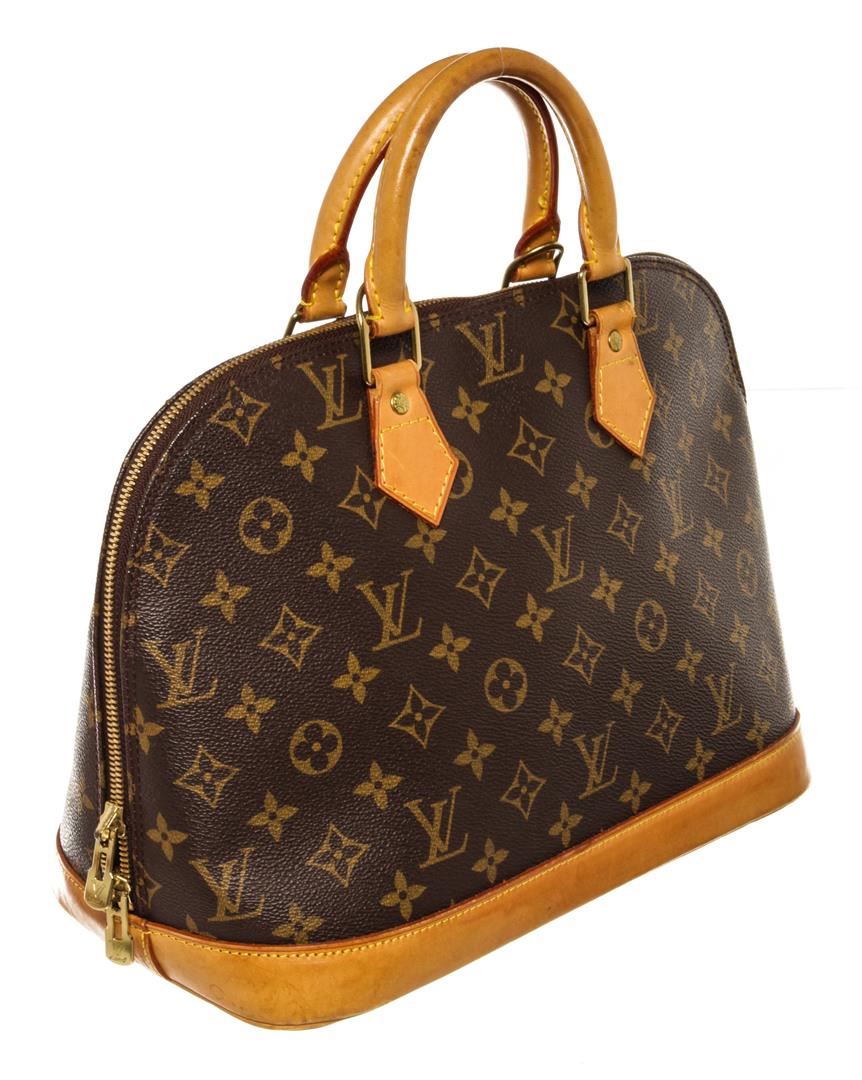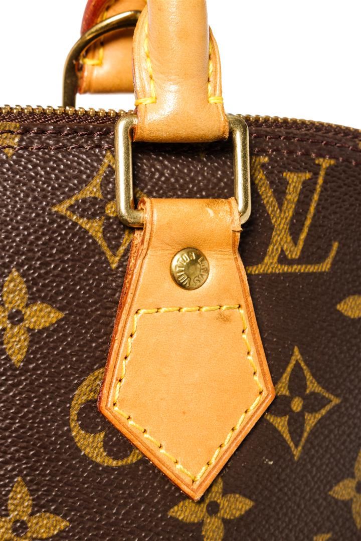Louis Vuitton Monogram Alma PM, with gold tone hardware, Tan Vachetta leather trim, brown fabric lining, two interior slip pockets, rolled top handles with a leather strap, and zipper closure.