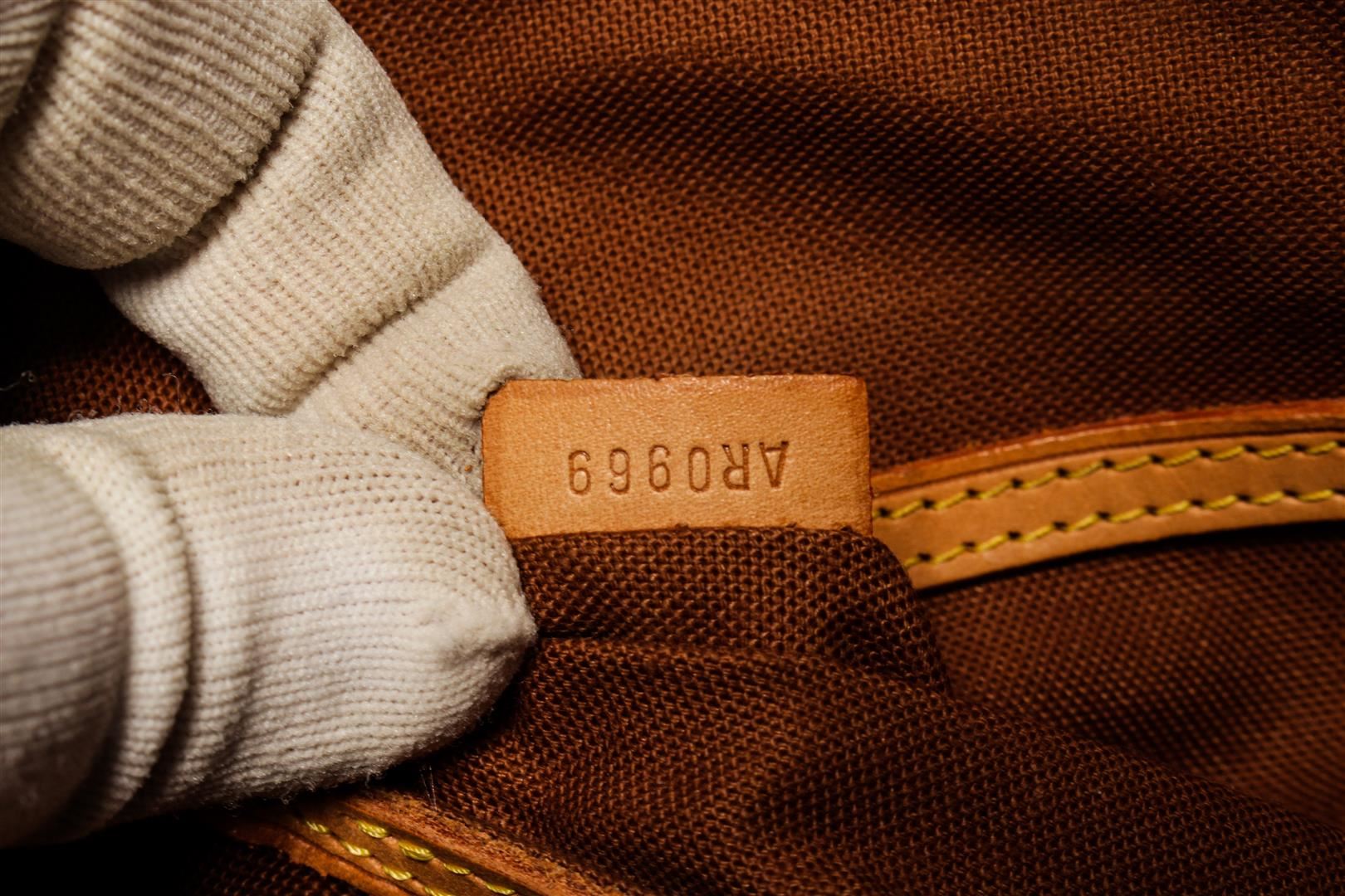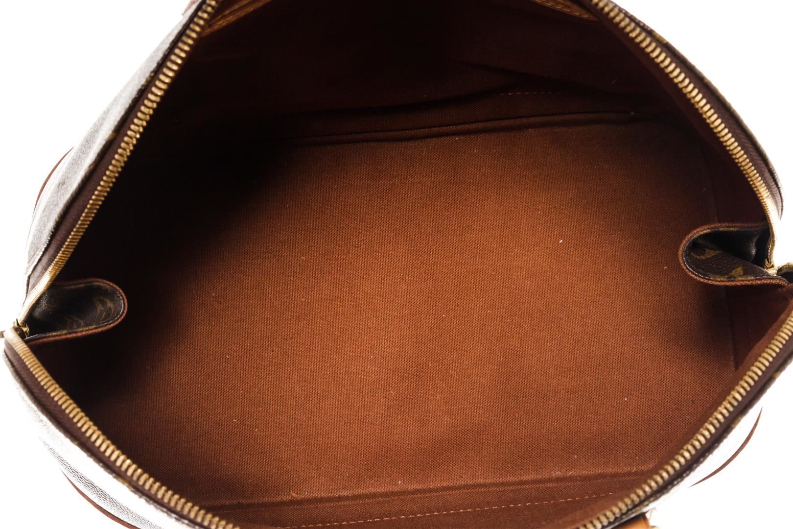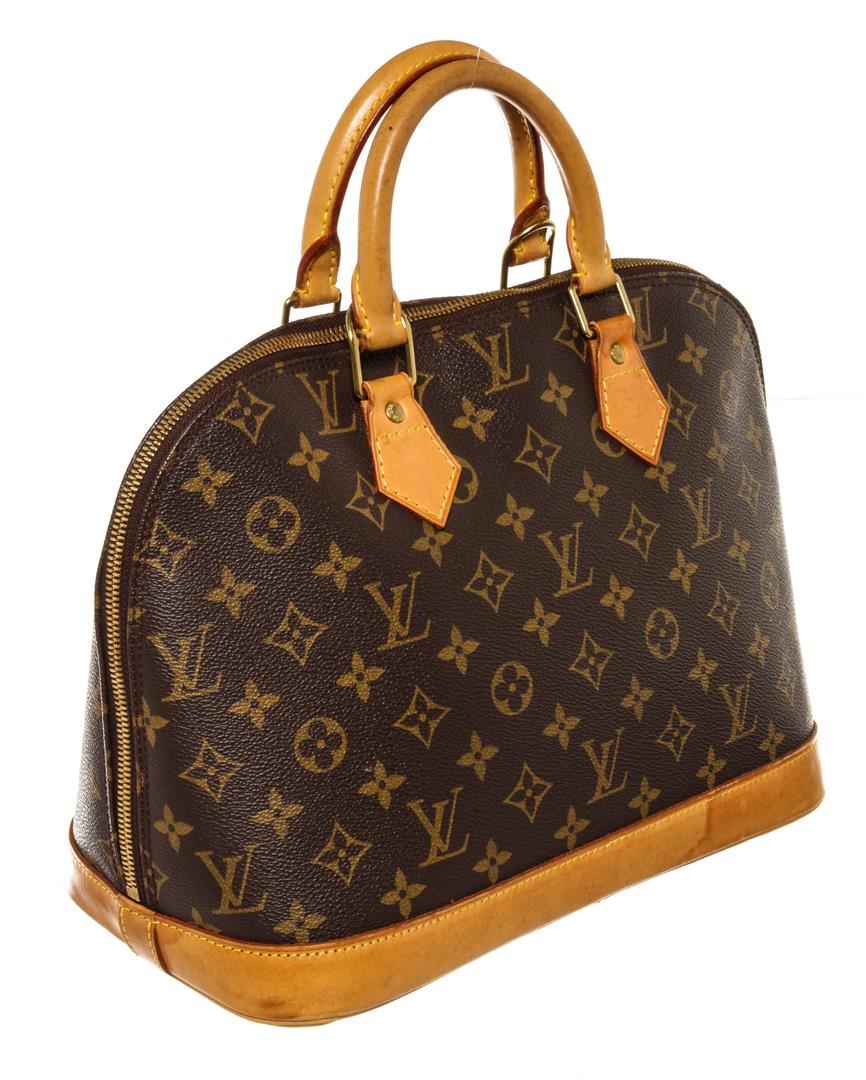 Louis Vuitton Monogram Alma PM, with gold tone hardware, Tan Vachetta leather trim, brown fabric lining, two interior slip pockets, rolled top handles with a leather strap, and zipper closure.