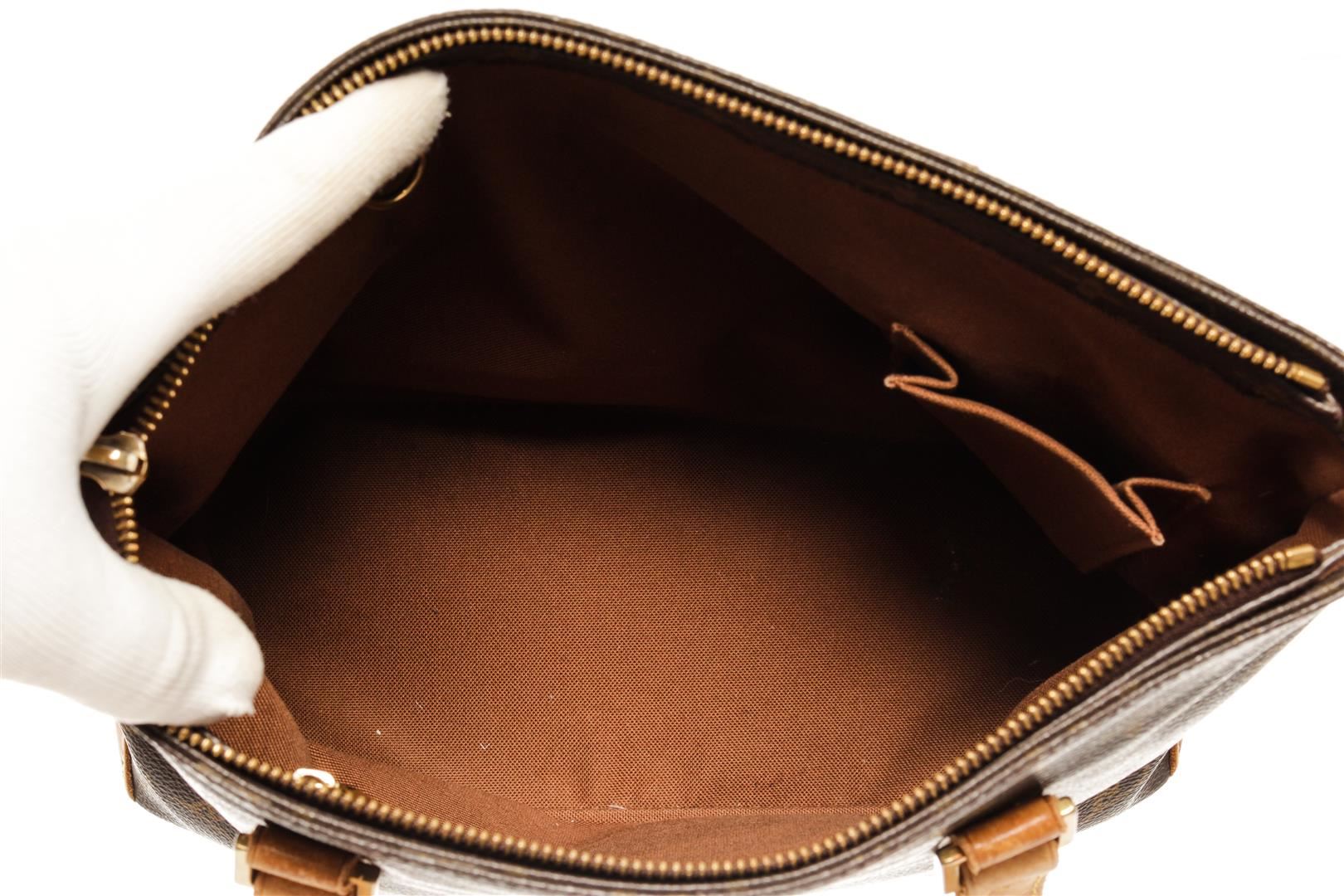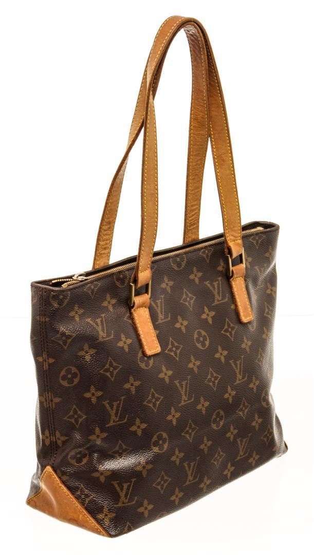 One Louis Vuitton Monogram Cabas Piano Handbag. Item is sold AS-IS. All available information is listed in the description and shown in the photo. Louis Vuitton Monogram Cabas Piano handbag with brown coated canvas exterior, brown fabric lining, contrasting vachetta leather top handles and bottom, gold-tone hardware, zipper closure, and one main compartment with one zip pocket.