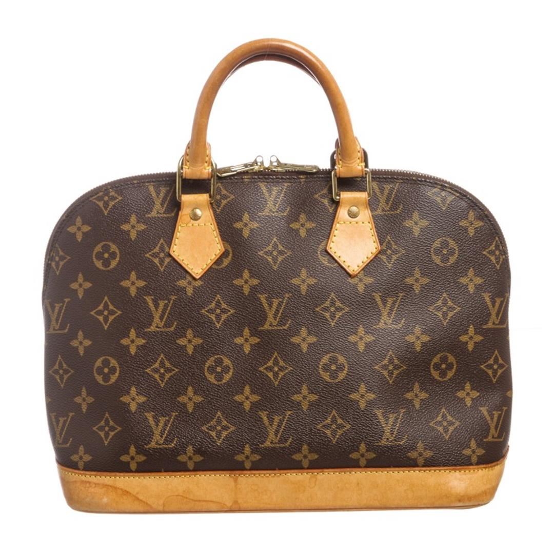 Brown and tan monogram coated canvas Louis Vuitton Alma PM with brass hardware, tan vachetta leather trim, dual rolled top handles, brown canvas lining, single pocket at interior wall and zip closure at top. Item is Pre-Owned.