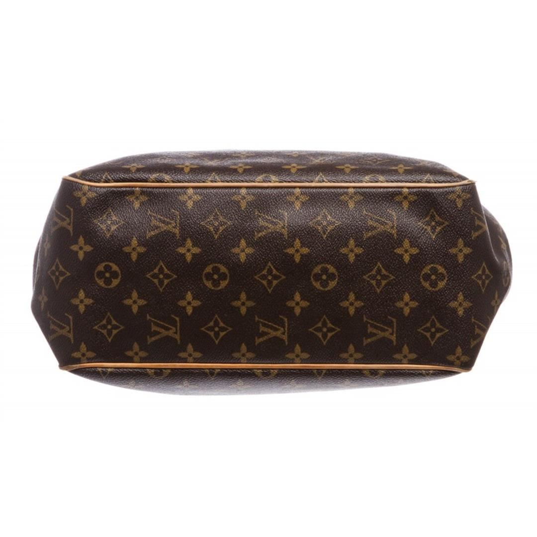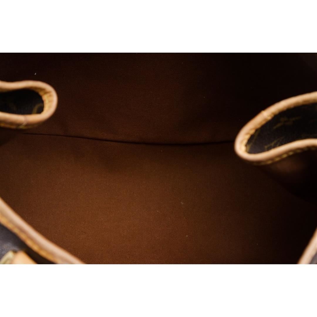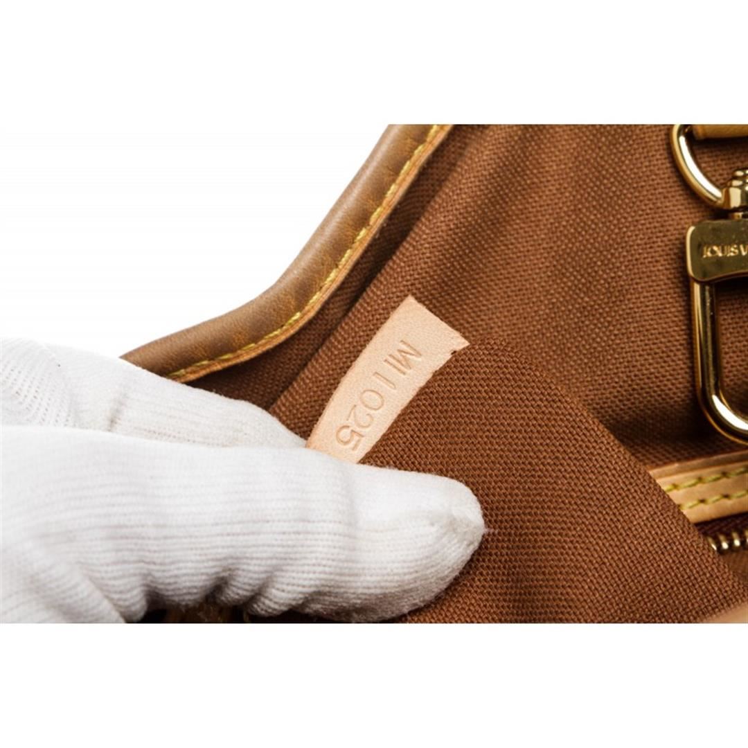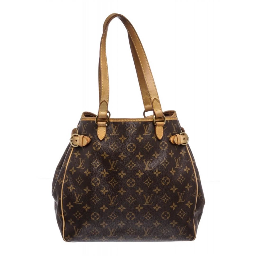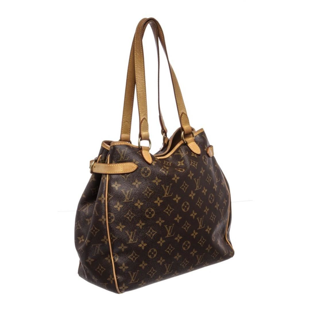 Brown and tan monogram coated canvas Louis Vuitton Batignolles Vertical bag with brass hardware, tan vachetta leather accents, dual flat shoulder straps, brown canvas lining, dual pockets at interior walls; one with zip closure and open top.
