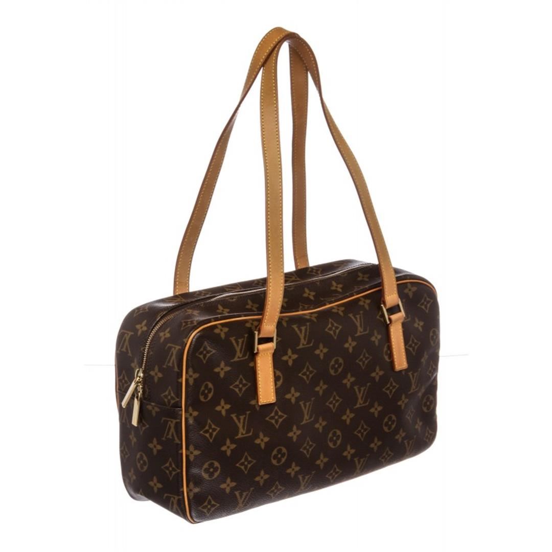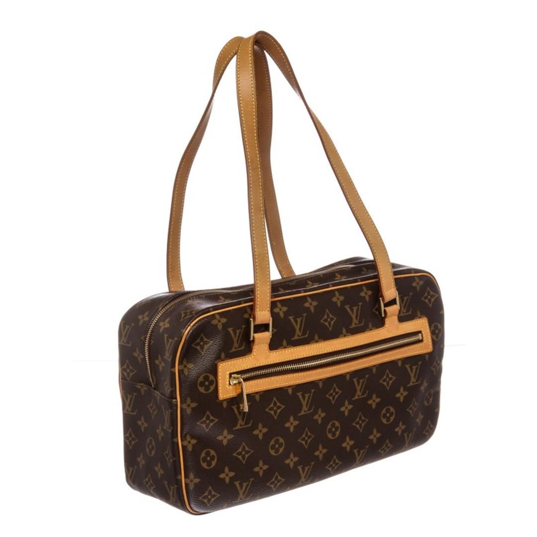 Brown and tan monogram coated canvas Louis Vuitton Cite GM with brass hardware, tan vachetta trim, single zip pocket at exterior, dual flat shoulder straps, beige Alcantara lining, three interior pockets; one with zip closure and two-way zip closure at top. Item is pre-owned.