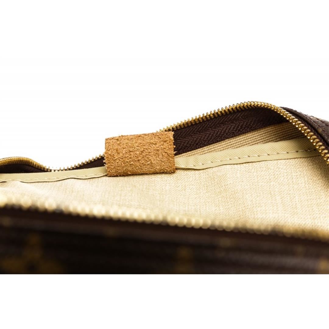 Brown and tan monogram coated canvas Louis Vuitton Deauville Bag with brass hardware, tan vachetta leather lining, dual rolled handles, single open compartment at exterior front, creme canvas lining, four open pockets at interior wall and two-way zip closures at top.