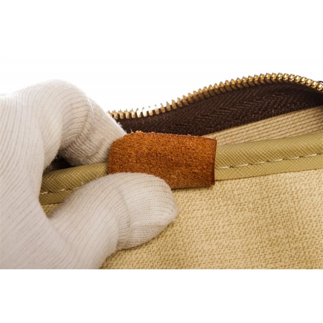 Brown and tan monogram coated canvas Louis Vuitton Deauville Bag with brass hardware, tan vachetta leather lining, dual rolled handles, single open compartment at exterior front, creme canvas lining, four open pockets at interior wall and two-way zip clos