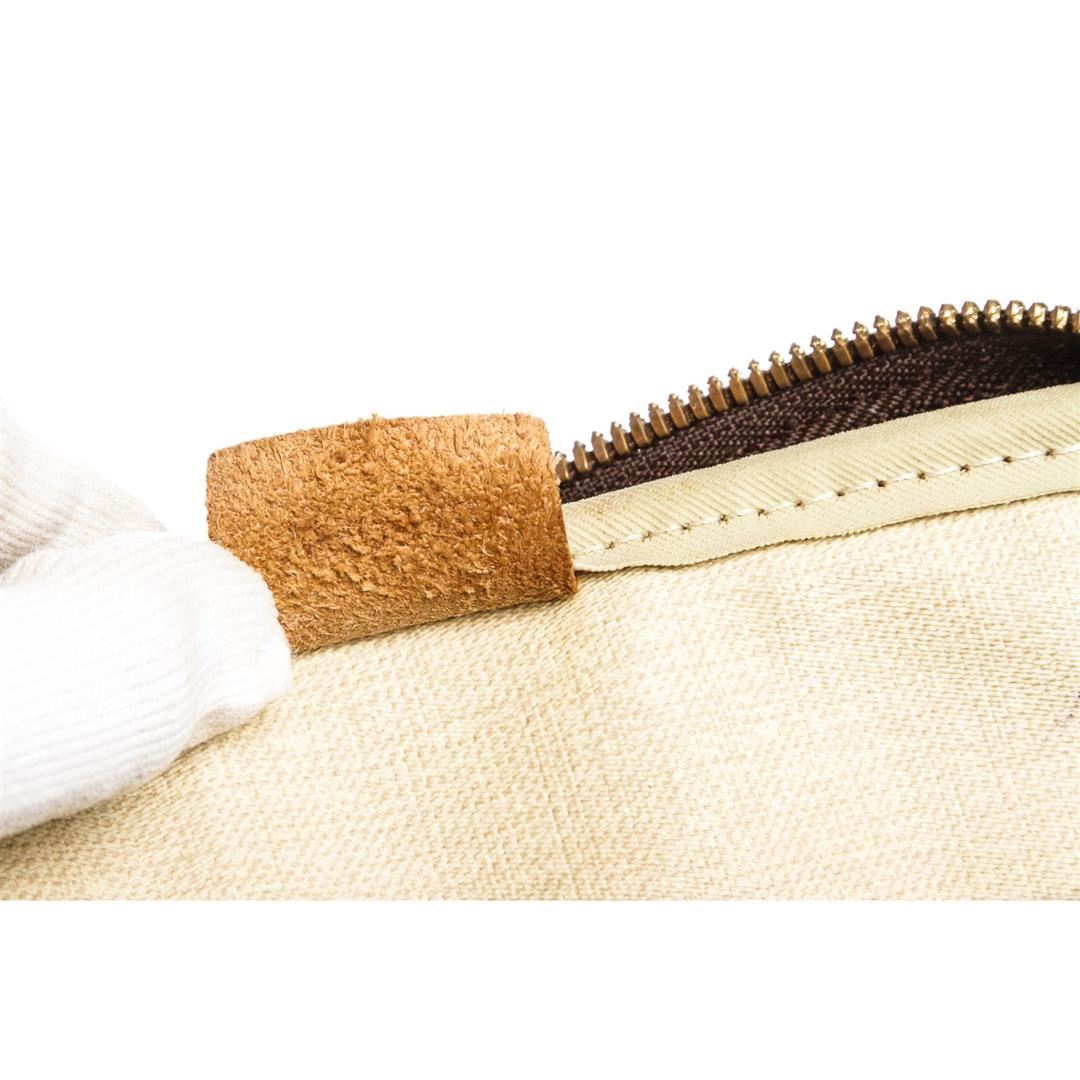 Brown and tan monogram coated canvas Louis Vuitton Deauville Bag with brass hardware, tan vachetta leather lining, dual rolled handles, single open compartment at exterior front, creme canvas lining, four open pockets at interior wall and two-way zip clos