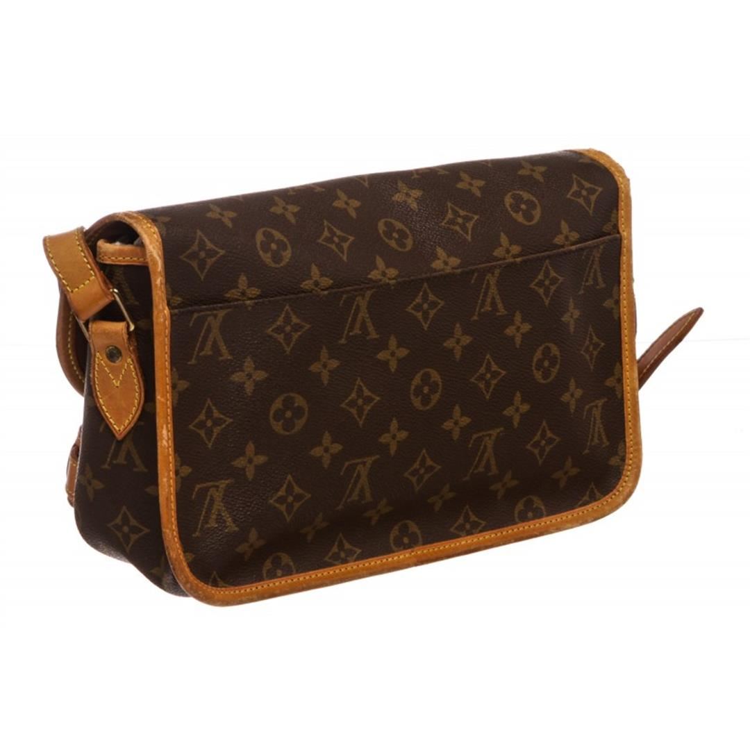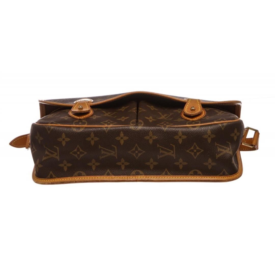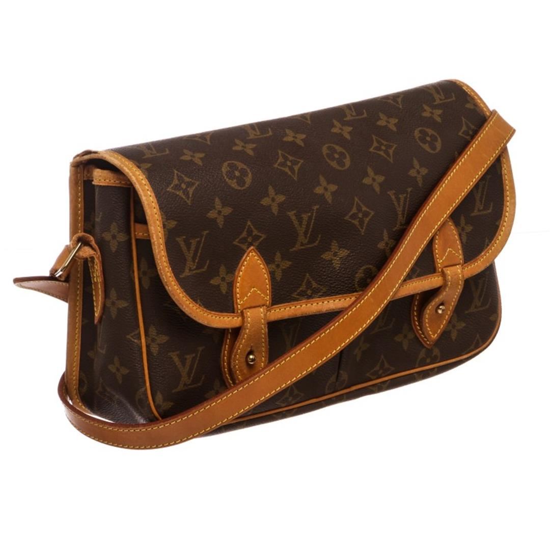 Brown and tan Monogram coated canvas Louis Vuitton Sac Gibeciere MM with brass hardware, tan vachetta leather accents, adjustable flat shoulder strap, dual pockets at front flap underside, brown canvas interior lining and dual buckle closure straps at fro