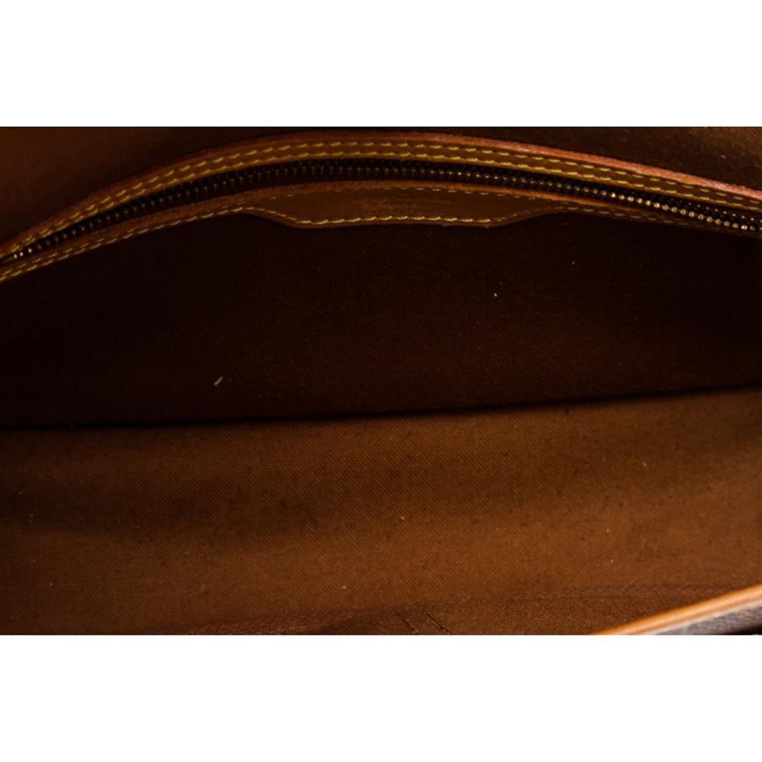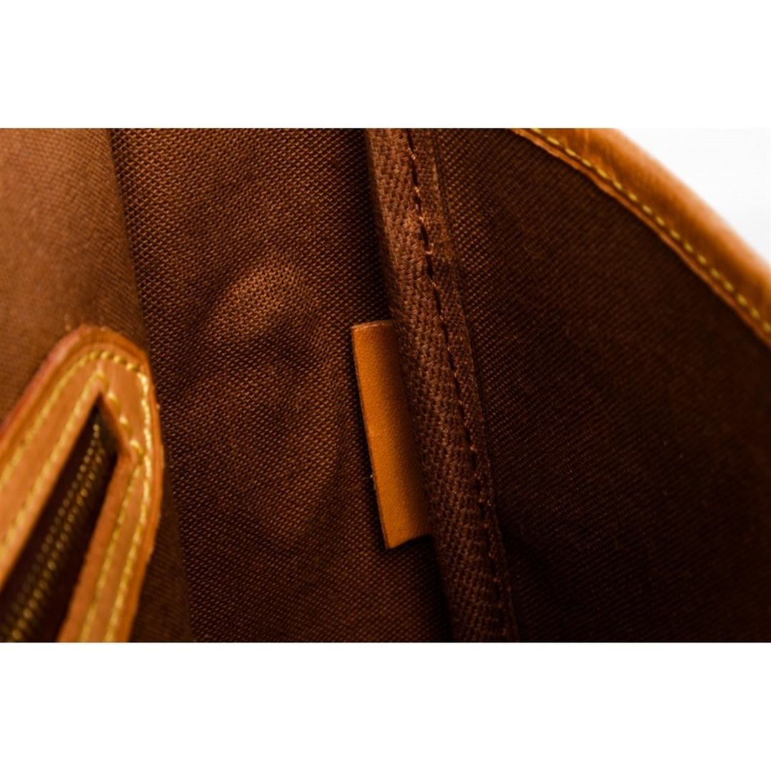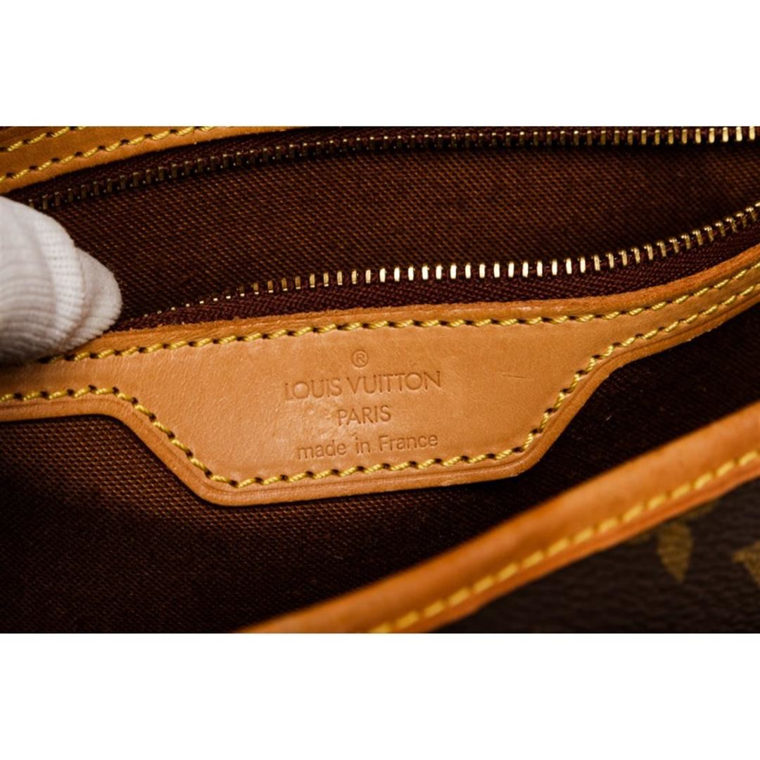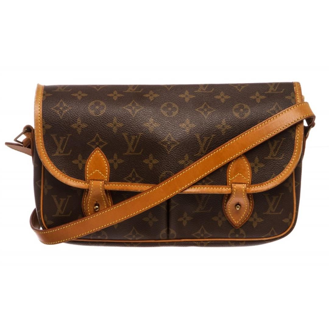 Brown and tan Monogram coated canvas Louis Vuitton Sac Gibeciere MM with brass hardware, tan vachetta leather accents, adjustable flat shoulder strap, dual pockets at front flap underside, brown canvas interior lining and dual buckle closure straps at fro