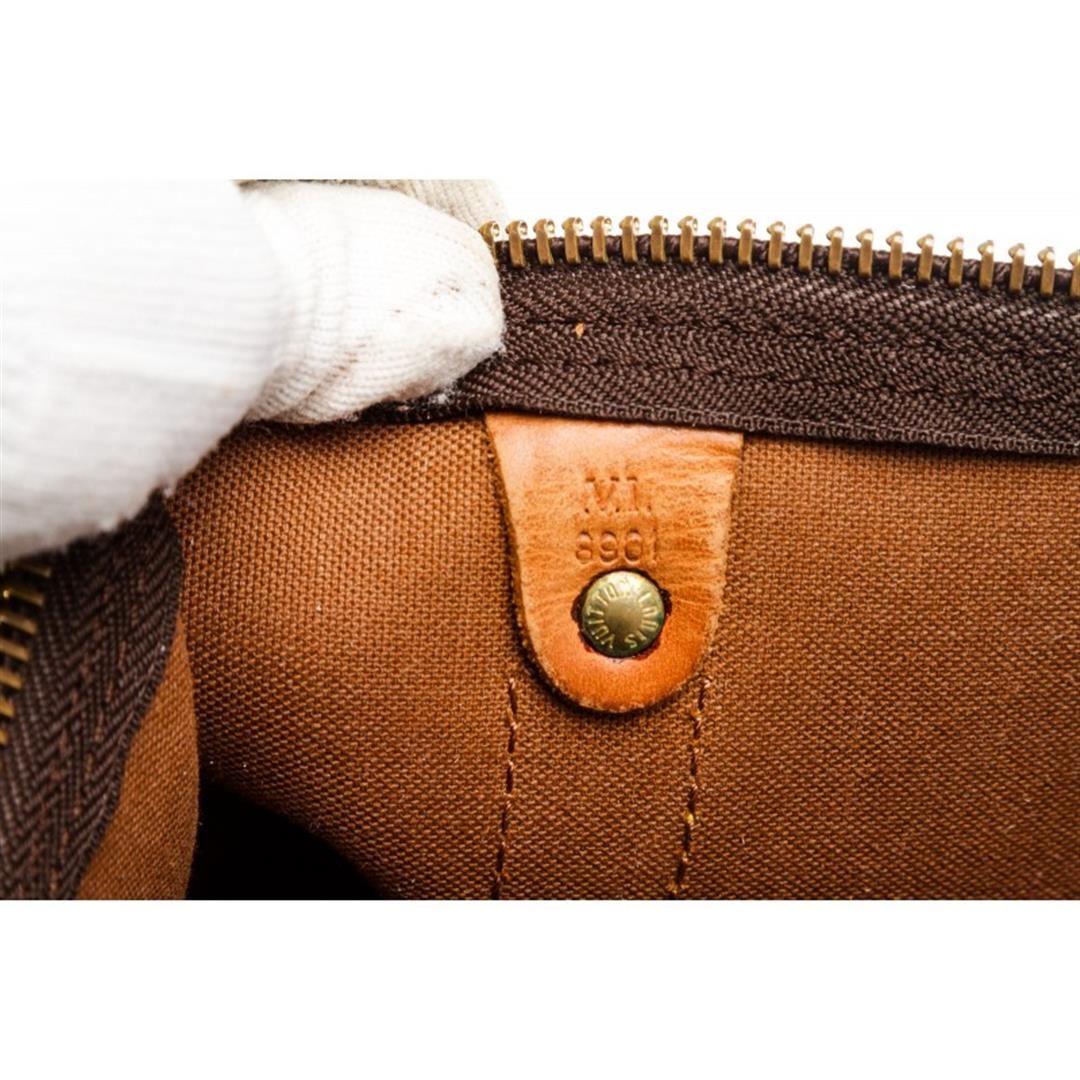 Brown and tan monogram coated canvas Louis Vuitton Keepall Bandoulière 55 with brass hardware, tan vachetta leather trim featuring yellow contrast stitching, flat detachable shoulder strap, dual rolled top handles, luggage tag, brown canvas lining and zip